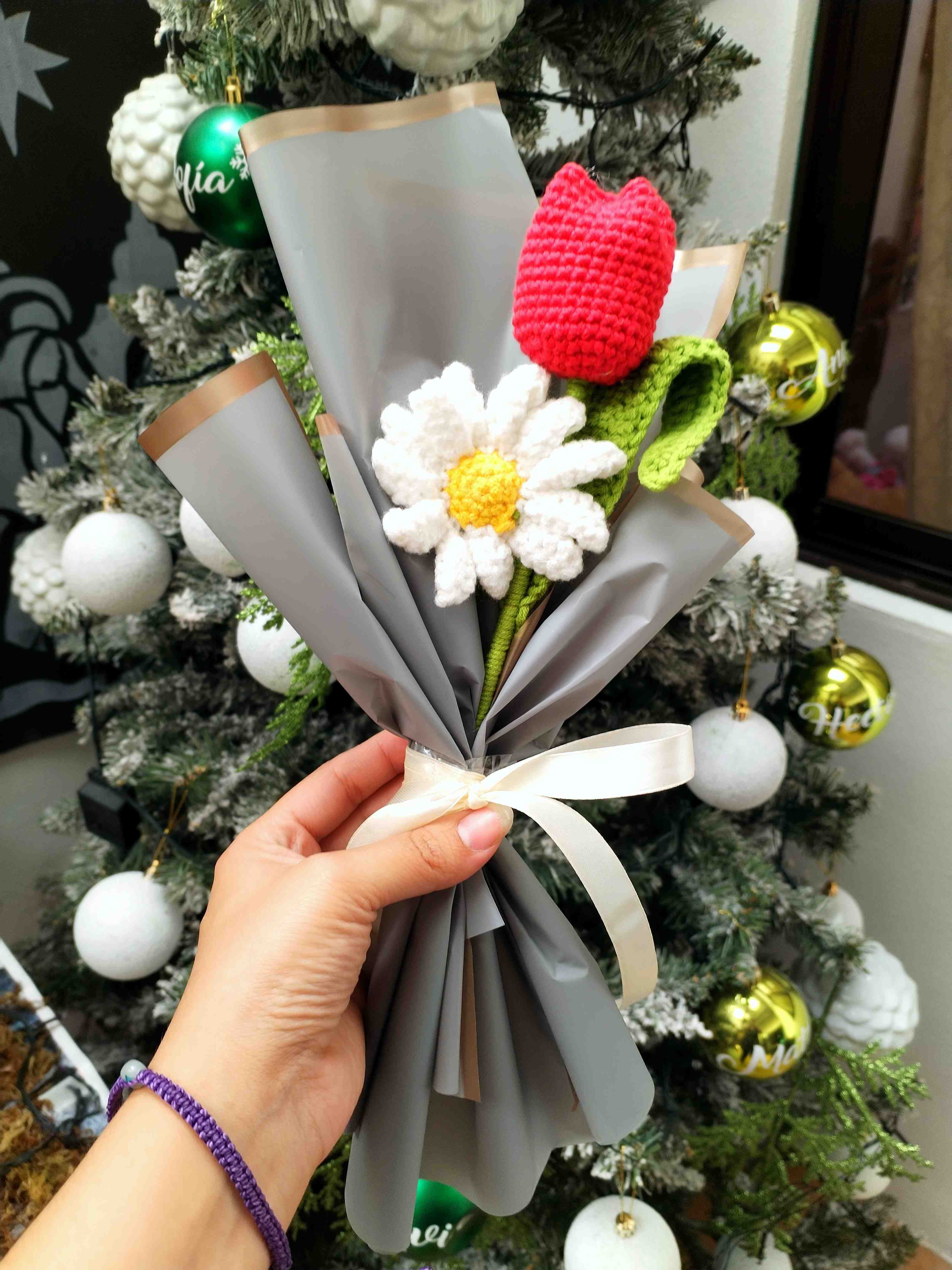 Este encantador ramo de flores tejidas a mano es perfecto para decorar cualquier espacio o regalar en ocasiones especiales. Incluye una flor roja y una margarita blanca, ambas elaboradas con gran detalle. El ramo está envuelto en un elegante papel gris y atado con un lazo blanco, lo que le da un toque sofisticado. Ideal para quienes aprecian el arte y la creatividad en la decoración.
