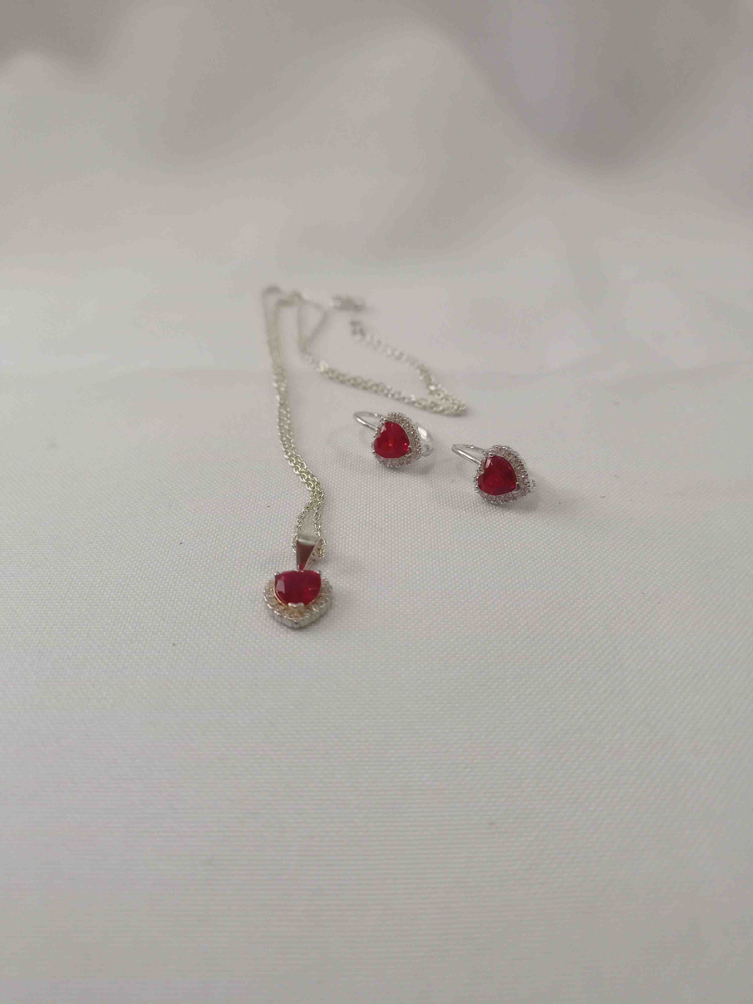 Este hermoso conjunto de joyería en plata 925, incluye un collar de 50cm y un par de aretes, cada uno adornado con un brillante colgante en forma de corazón rojo. El diseño elegante y sofisticado es perfecto para ocasiones especiales o para añadir un toque de glamour a tu día a día. Fabricado con materiales de alta calidad, este conjunto es una excelente opción para regalar o para consentirte a ti misma. Su diseño atemporal asegura que nunca pase de moda.