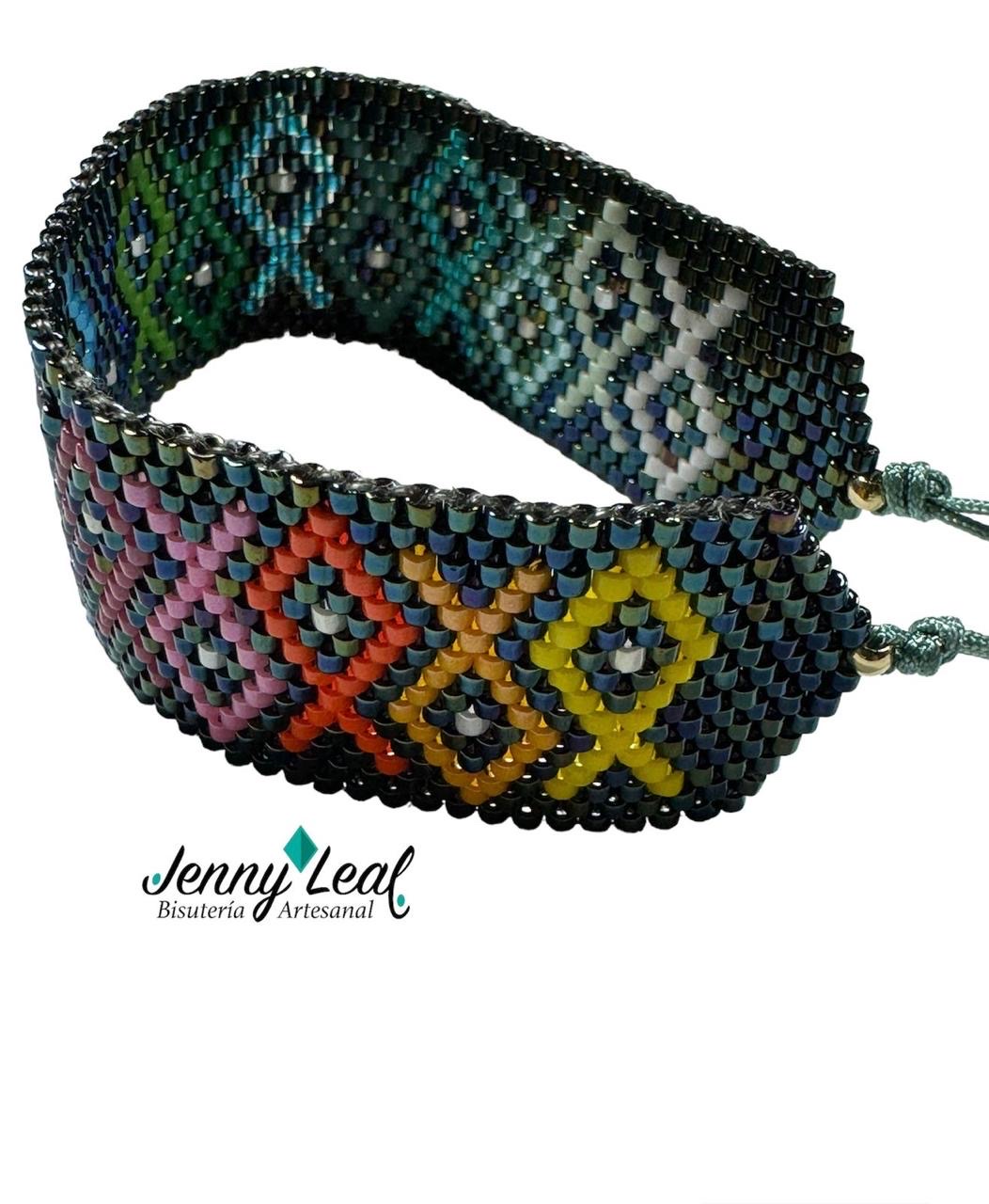 Pulsera cocida a mano con abalorios de vidrio calibrado.