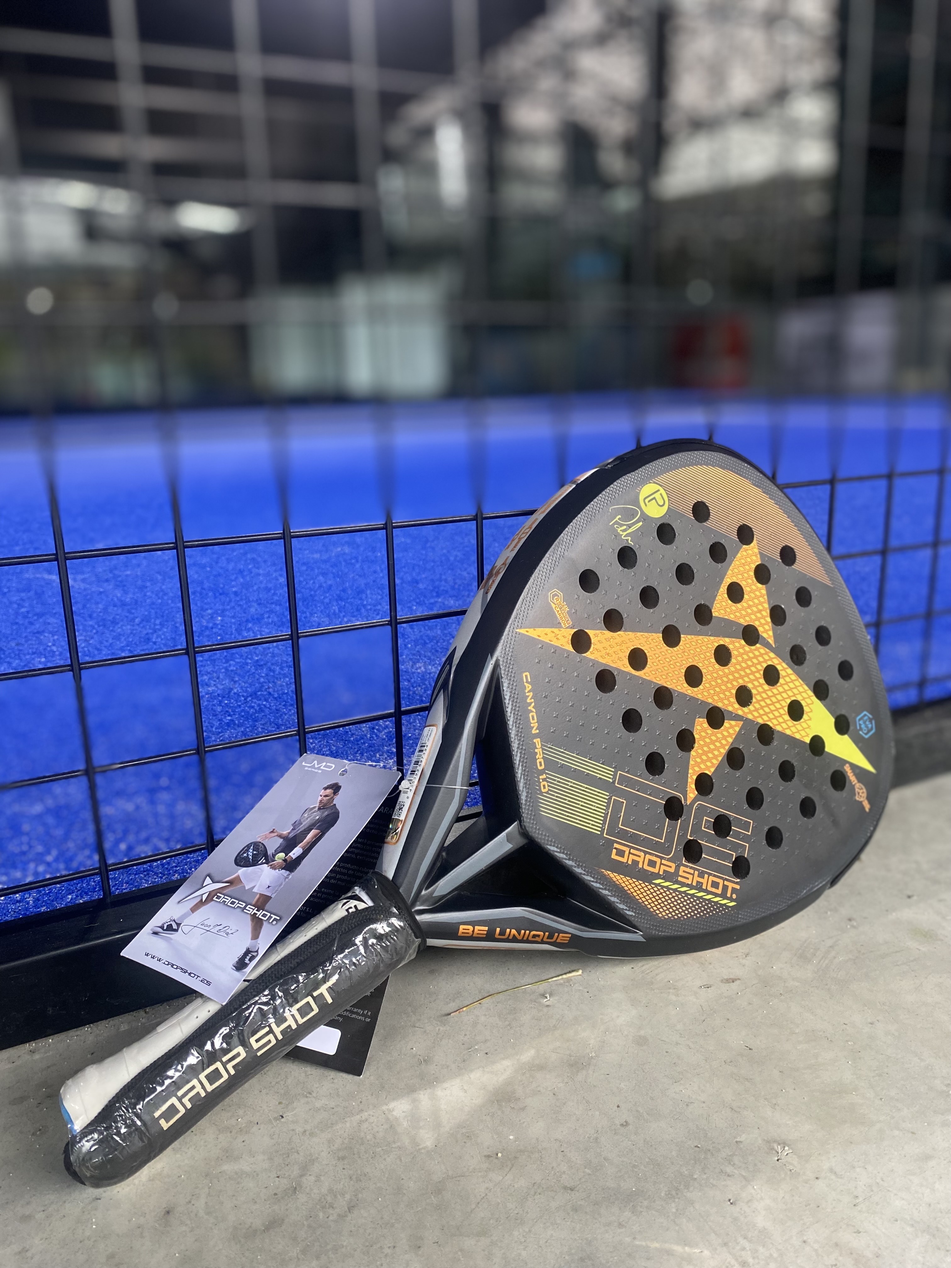 Pala de pádel marca Drop Shot con detalles naranjas