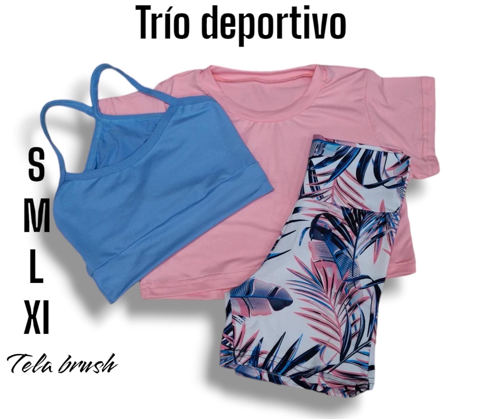 Conjunto deportivo que incluye un croptop, un top deportivo, y una licra. Disponible en talla S, M, L y XL.