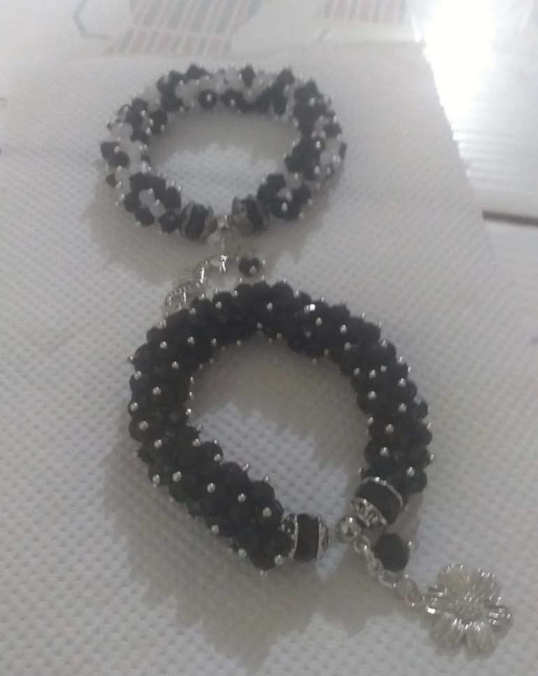 Hermosas pulseras hechas a mano con cuentas negras y blancas. Perfectas para cualquier ocasión, estas pulseras añaden un toque de elegancia a tu atuendo. El diseño incluye un colgante en forma de flor que le da un toque especial.