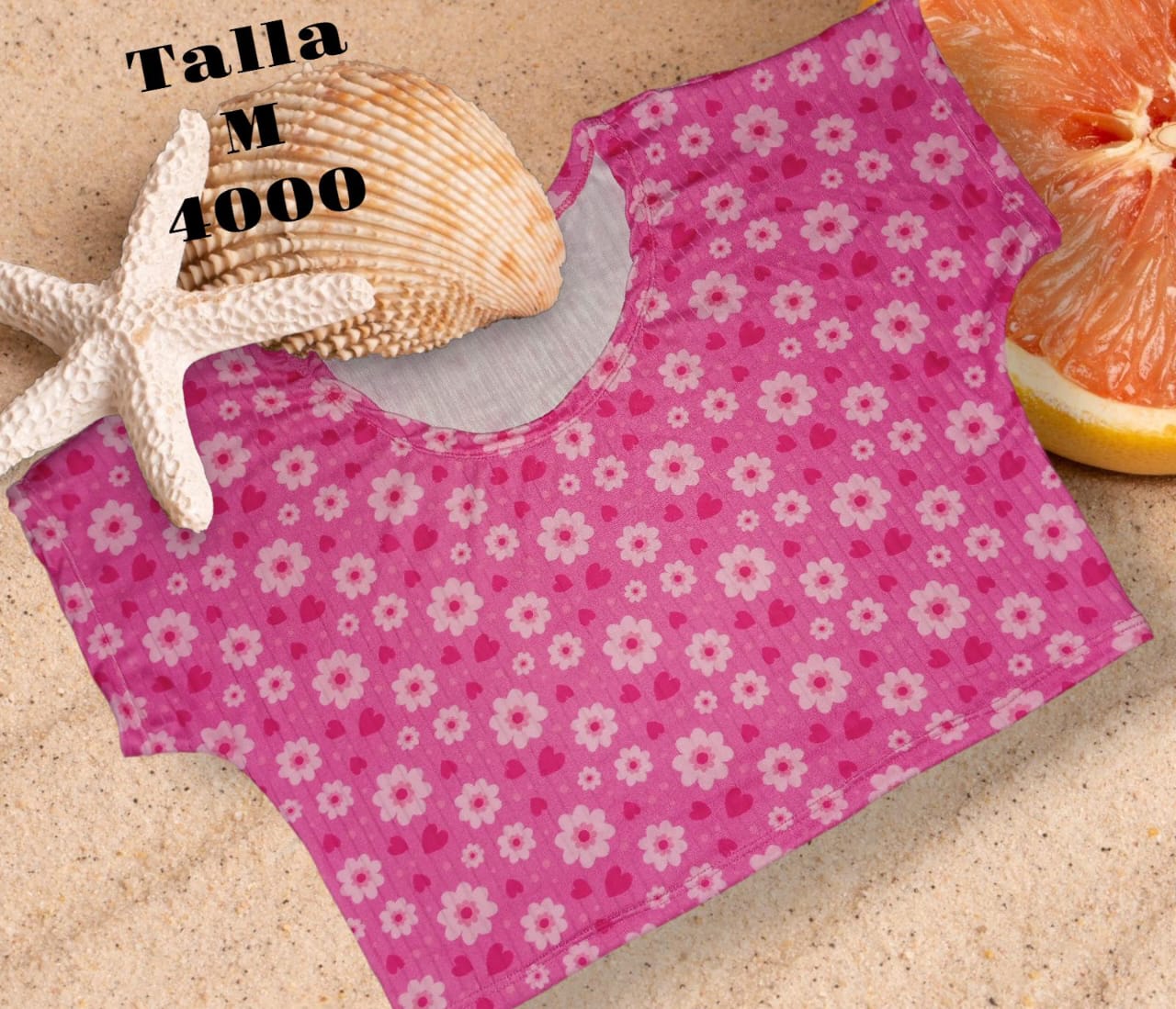 Camiseta de talla M con un encantador diseño floral en color rosa. Ideal para un look veraniego y fresco. Hecha con materiales cómodos y ligeros, perfecta para cualquier ocasión casual.