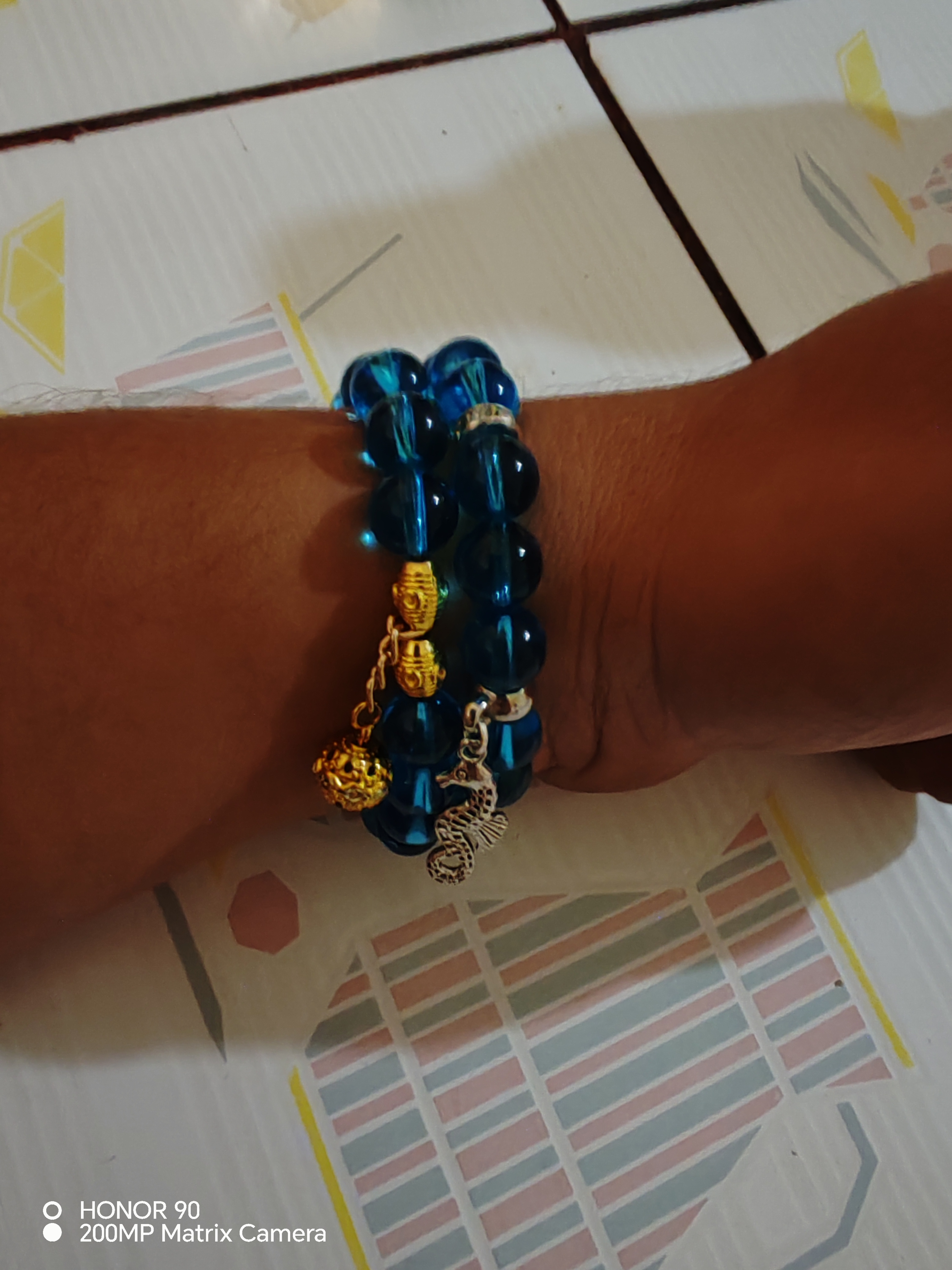 Elegante pulsera de cuentas azules con dijes dorados y plateados. Ideal para complementar cualquier atuendo con un toque de estilo. Perfecta para uso diario o eventos especiales.