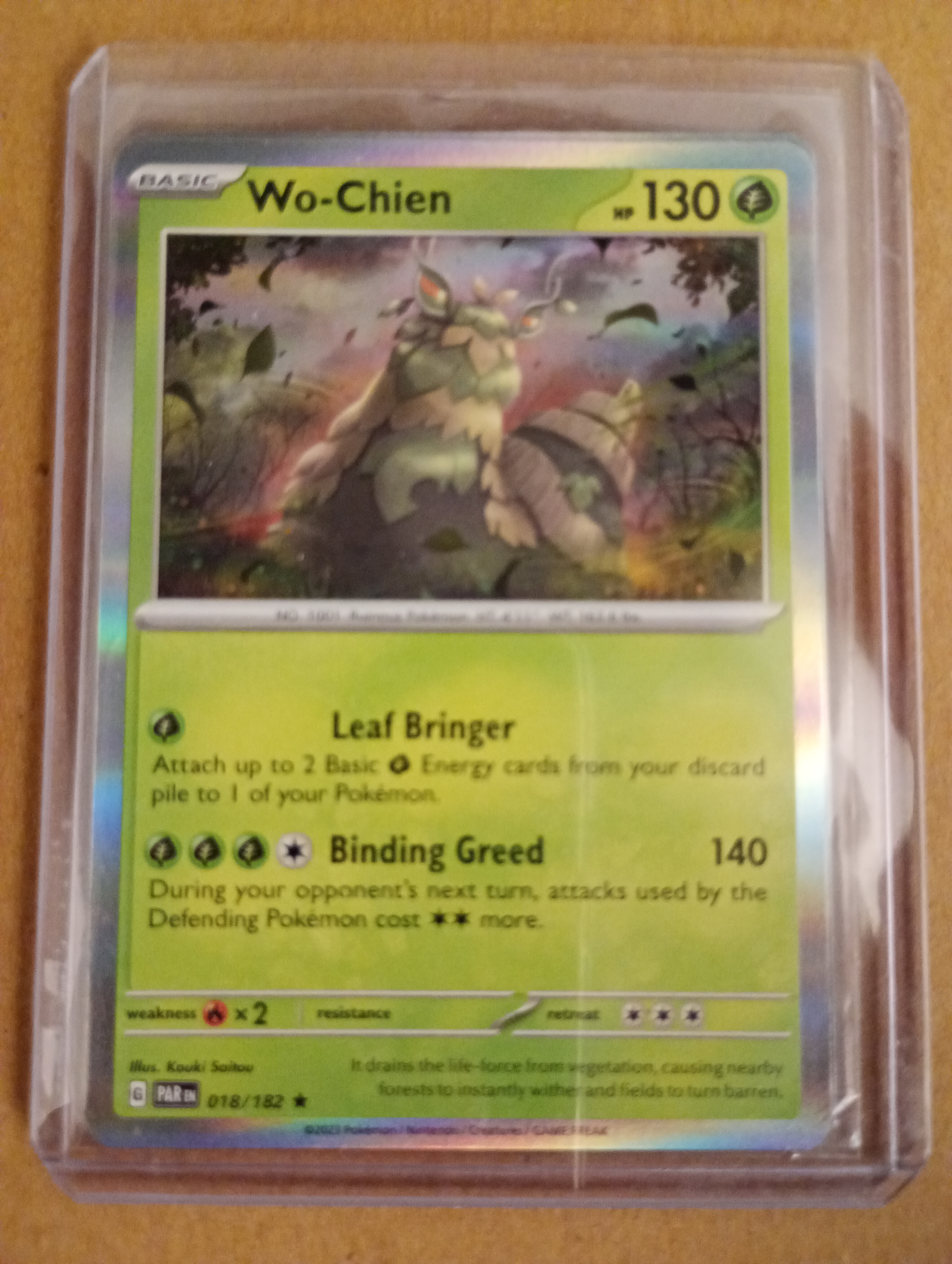 Esta es una carta Pokémon holográfica de Wo-Chien con 130 puntos de vida (HP). La carta presenta dos ataques: 'Leaf Bringer', que permite adjuntar hasta 2 cartas de energía básica de tipo planta desde tu pila de descarte a uno de tus Pokémon, y 'Binding Greed', que inflige 140 puntos de daño y aumenta el costo de los ataques del Pokémon defensor en el próximo turno del oponente. Es una carta de la serie 018/182, ilustrada por Kouki Saitou.