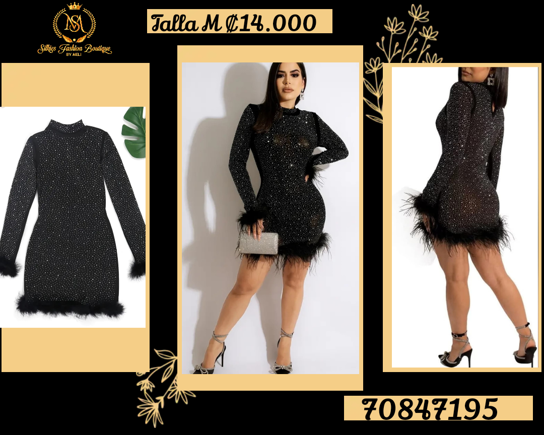 Este elegante vestido negro de talla M es perfecto para ocasiones especiales. Con un diseño brillante y detalles de plumas en los puños y el dobladillo, este vestido destaca por su sofisticación y estilo. Ideal para eventos nocturnos, combina a la perfección con accesorios plateados o negros. Su ajuste ceñido resalta la figura, ofreciendo un look glamuroso y moderno.
