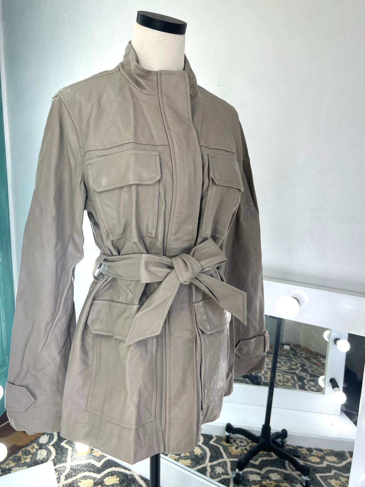 Chaqueta de cuero sintético beige con cinturón