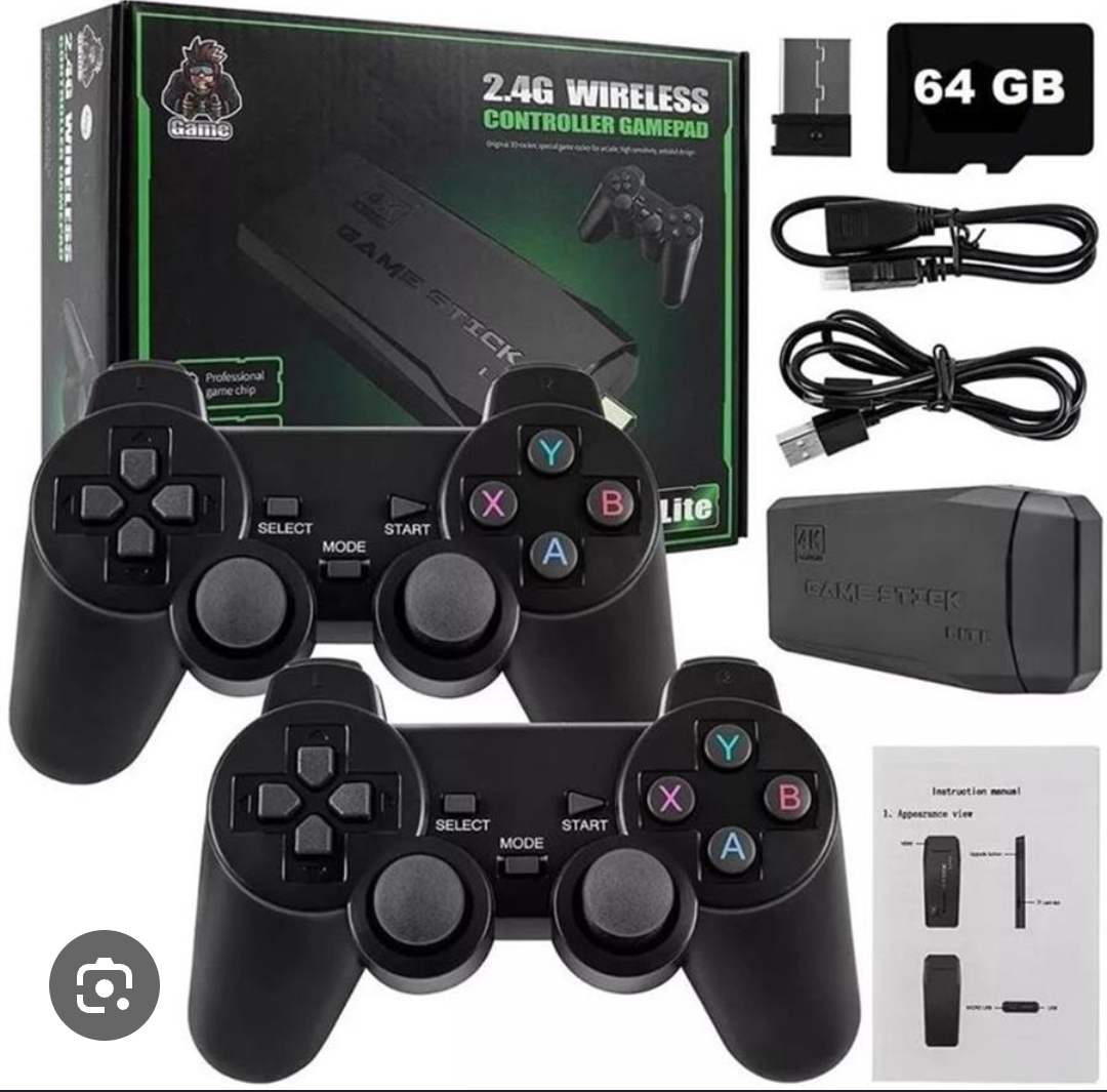Este set incluye un controlador inalámbrico 2.4G y un Game Stick para una experiencia de juego fluida y sin cables. Compatible con múltiples dispositivos, este controlador ofrece botones ergonómicos y una memoria de 64 GB para almacenar tus juegos favoritos. Incluye cables de carga y un manual de instrucciones para una fácil configuración.