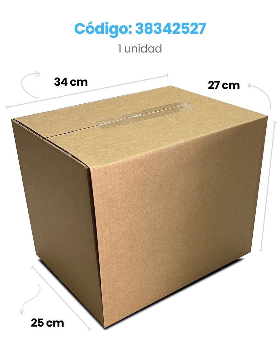 Caja de cartón de alta resistencia ideal para envíos y almacenamiento. Sus dimensiones son 34 cm de largo, 27 cm de ancho y 25 cm de alto, lo que la hace perfecta para guardar una variedad de artículos. Fabricada con materiales duraderos, garantiza la protección de su contenido durante el transporte.