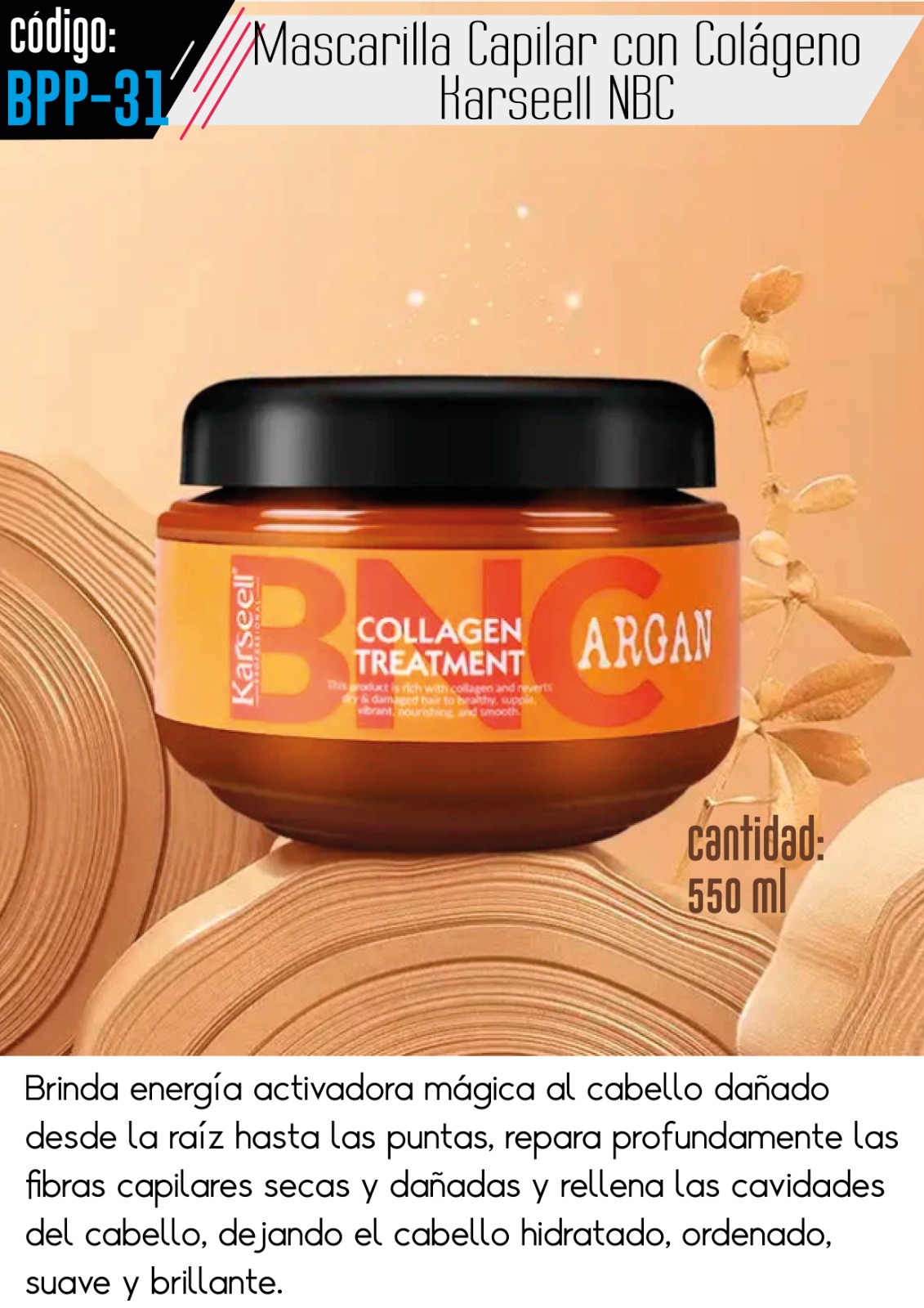 La Mascarilla Capilar con Colágeno Karseell NBC de 550 ml brinda energía activadora mágica al cabello dañado desde la raíz hasta las puntas. Repara profundamente las fibras capilares secas y dañadas, rellenando las cavidades del cabello. Deja el cabello hidratado, ordenado, suave y brillante.