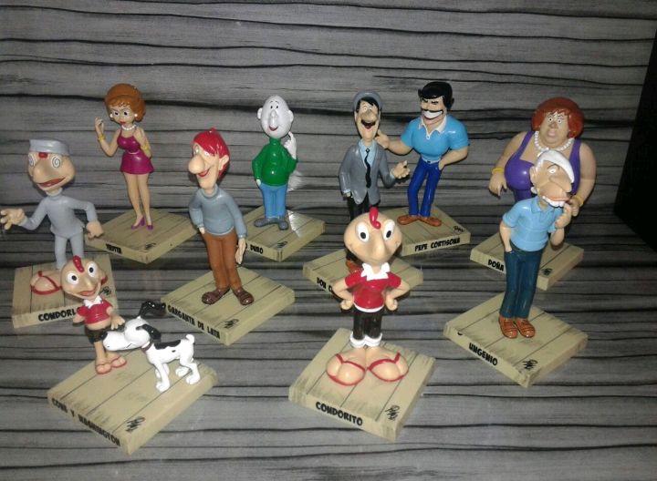 Conjunto de figuras de colección de los personajes de Condorito. Incluye a Condorito, Garganta de Lata, Pepe Cortisona, y otros personajes icónicos. Cada figura está detalladamente pintada y montada sobre una base con el nombre del personaje. Ideal para fanáticos del cómic y coleccionistas.