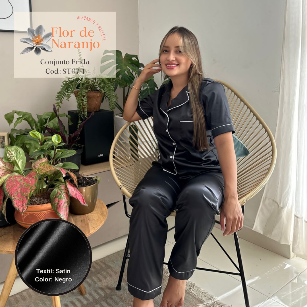 Disfruta de una noche de descanso y belleza con el Conjunto Frida de Flor de Naranjo. Este elegante pijama está confeccionado en satín de alta calidad, ofreciendo una sensación suave y lujosa en la piel. Su diseño en color negro con detalles en blanco aporta un toque de sofisticación y estilo. Ideal para relajarte en casa con comodidad y elegancia.