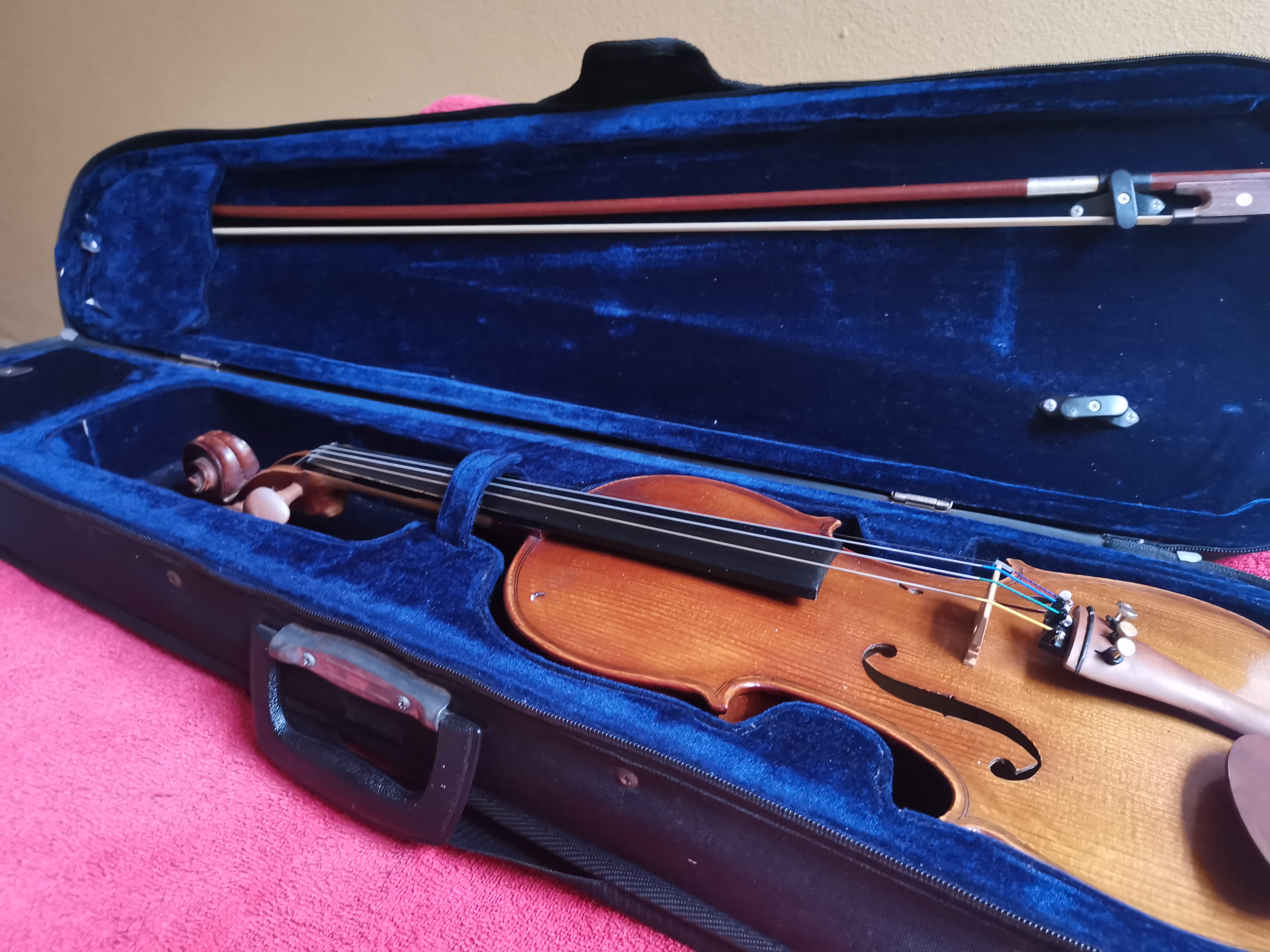 Este violín clásico viene acompañado de un estuche acolchado de color azul, ideal para proteger el instrumento durante el transporte. El violín presenta un acabado en madera de alta calidad, con cuerdas bien tensadas y un arco incluido. Perfecto para músicos de todos los niveles, desde principiantes hasta profesionales.