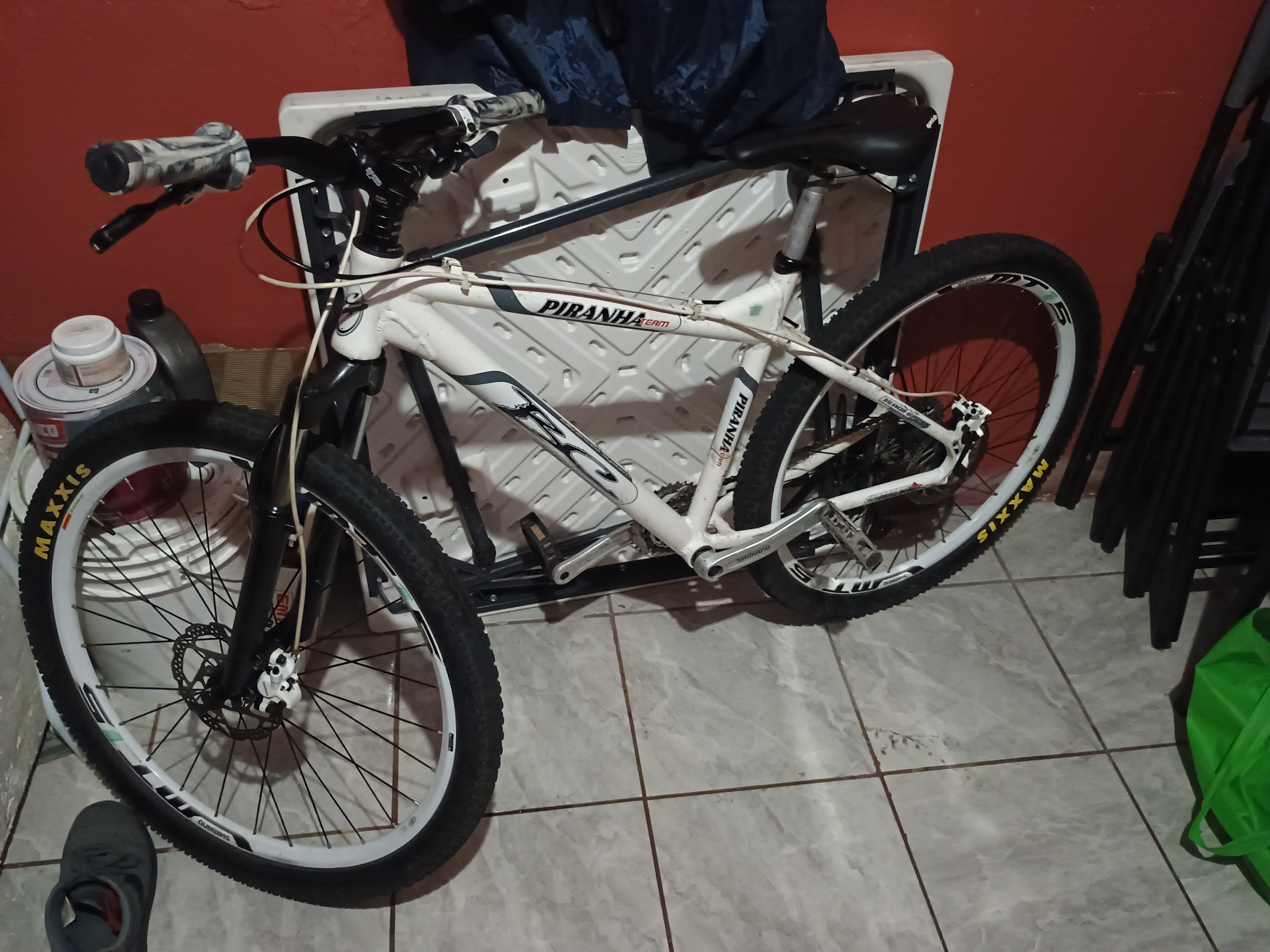 Bicicleta de montaña Piranha en color blanco con detalles en negro. Equipada con neumáticos Maxxis y frenos de disco para un mejor rendimiento en terrenos difíciles. Ideal para los amantes del ciclismo de montaña que buscan una bicicleta resistente y de calidad.