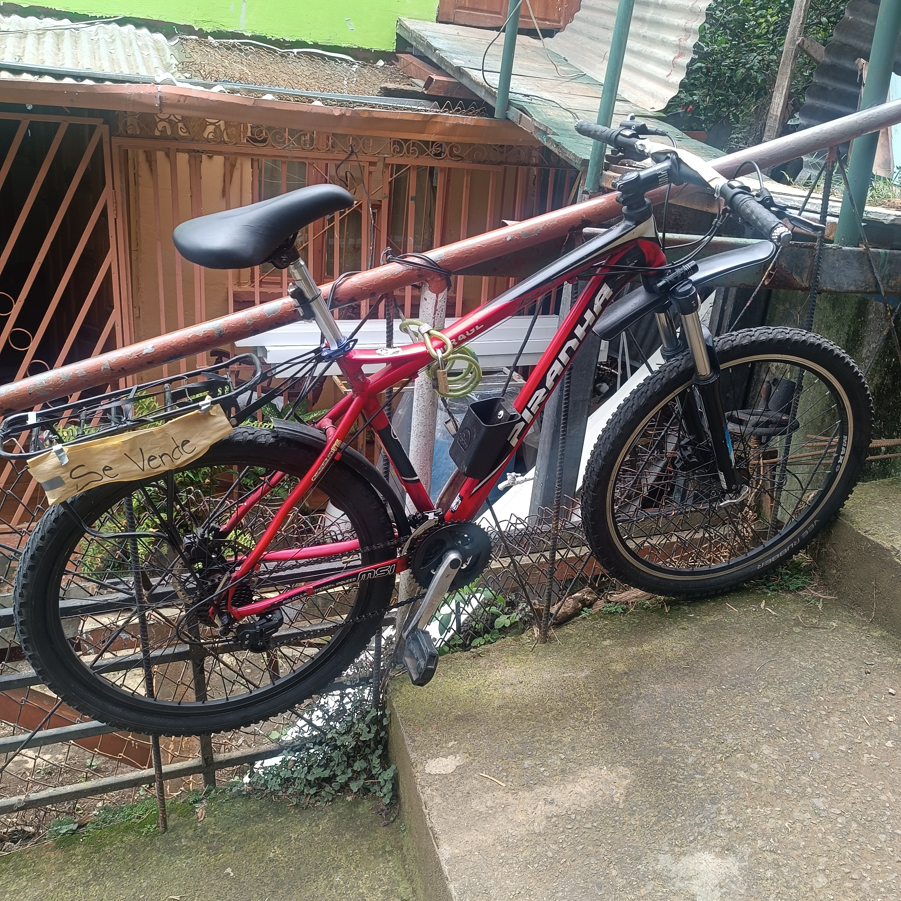 Bicicleta de montaña marca Ranhill en color rojo. Equipada con suspensión delantera, frenos de disco y un portaequipajes trasero. Ideal para rutas y terrenos irregulares. En buen estado y lista para su uso inmediato. sistema de frenos hidráulicos
