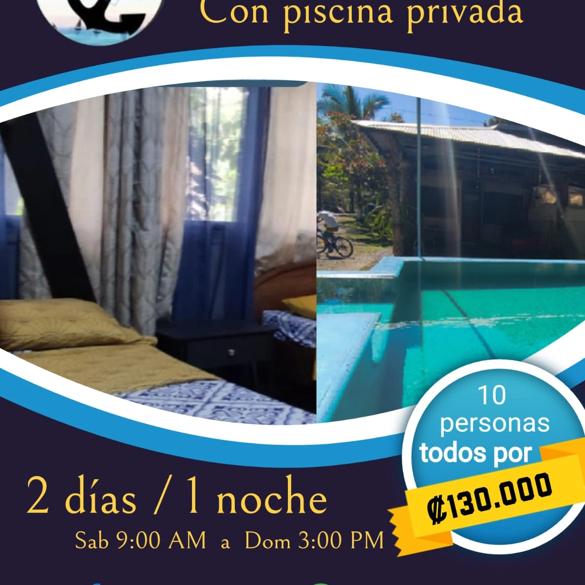 Disfruta de una escapada de 2 días y 1 noche en una acogedora casa de descanso con piscina privada. Ideal para grupos de hasta 10 personas, esta oferta incluye alojamiento desde el sábado a las 9:00 AM hasta el domingo a las 3:00 PM. Relájate y disfruta de un entorno tranquilo y cómodo por solo ₡130.000 (las 10 personas)