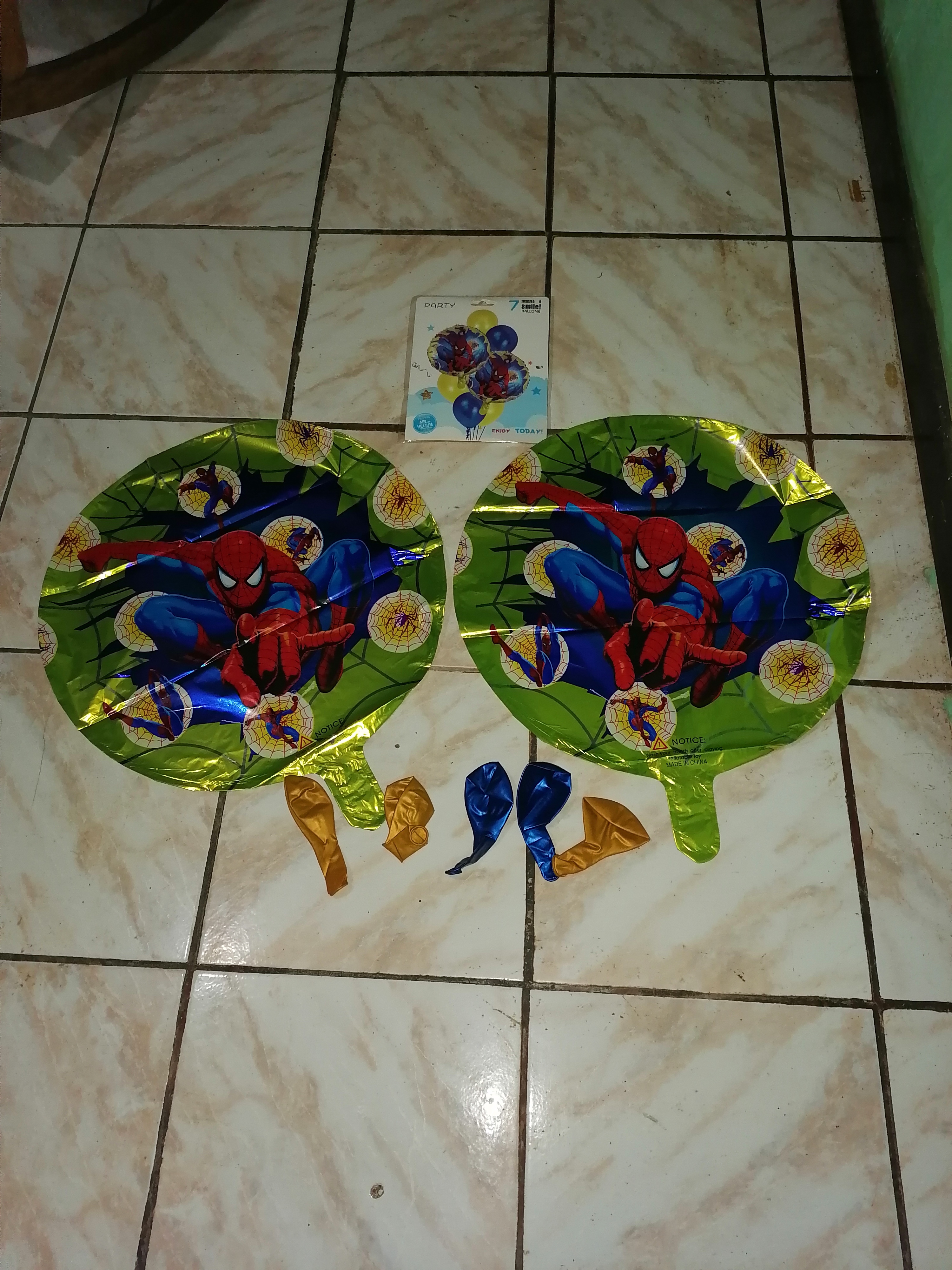 Set de globos de fiesta con diseño de Spiderman. Incluye dos globos grandes con la imagen del superhéroe y varios globos pequeños en colores azul y dorado. Perfecto para decorar fiestas temáticas y sorprender a los pequeños fans de Spiderman. Material resistente y fácil de inflar.
