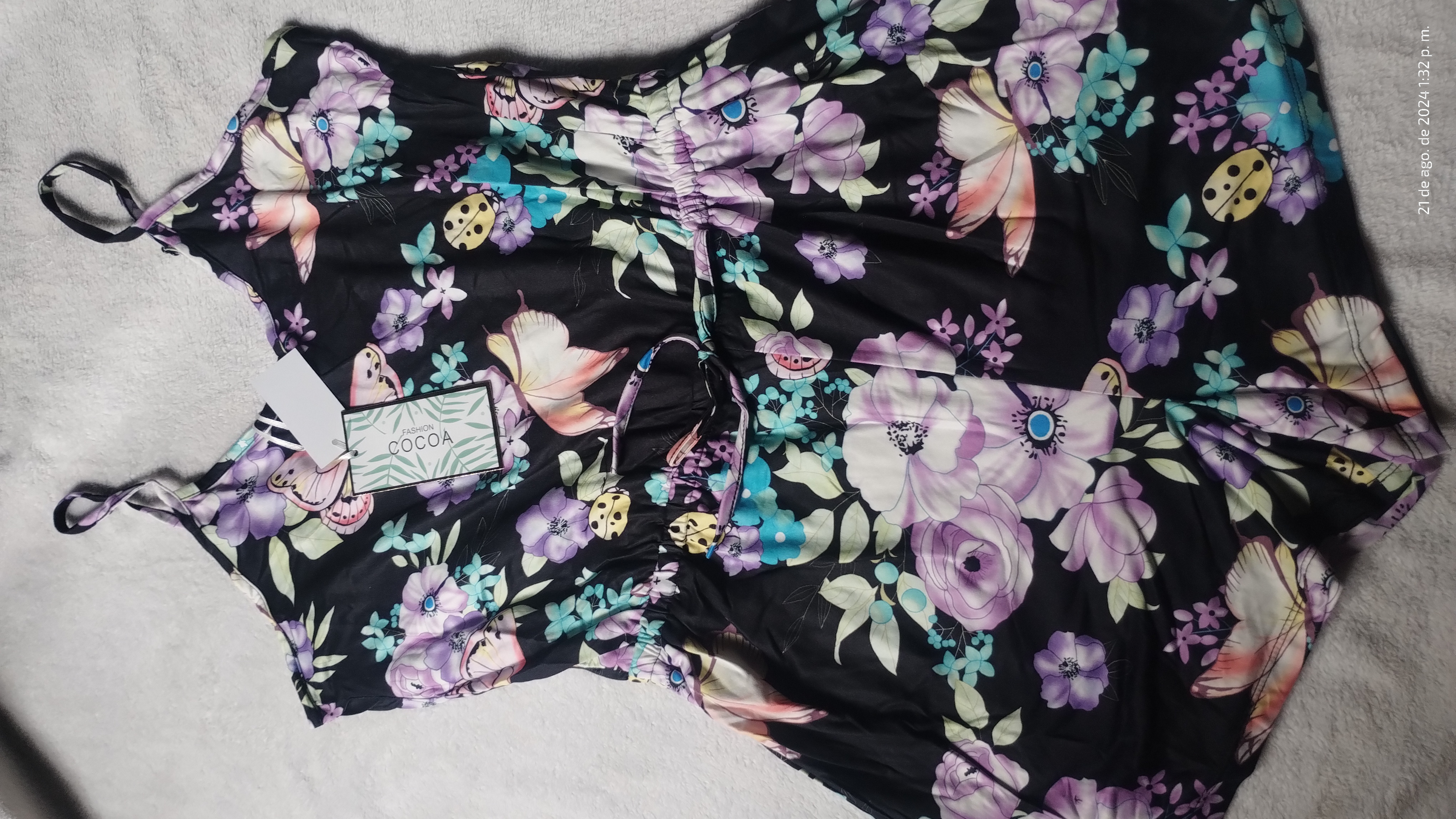 Este mono floral de verano es perfecto para los días cálidos. Con un diseño vibrante de flores en tonos morados, lilas y verdes sobre un fondo negro, este mono es tanto cómodo como elegante. Ideal para salidas casuales o eventos al aire libre, cuenta con tirantes ajustables y una cintura elástica para un ajuste perfecto. La tela ligera y suave asegura frescura y comodidad durante todo el día.