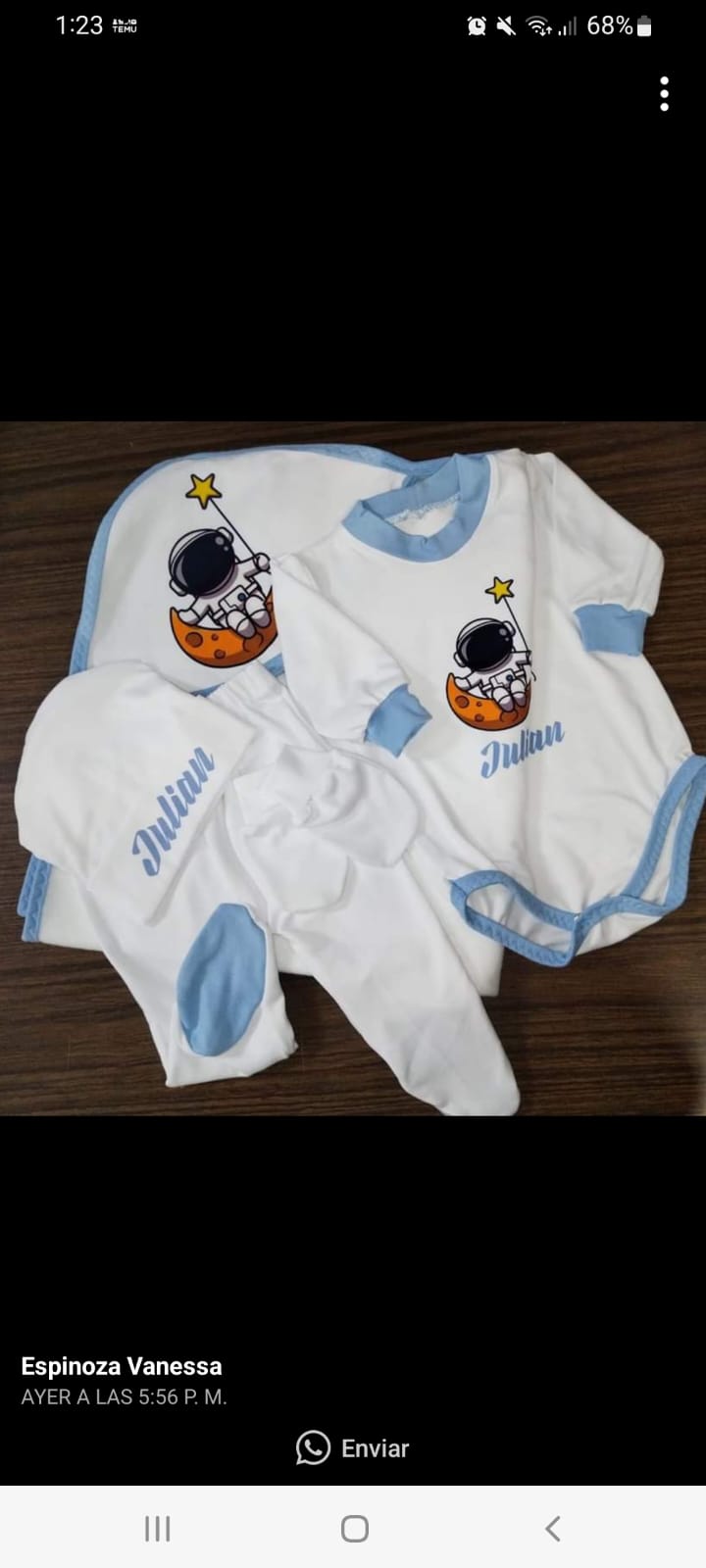 Este adorable conjunto de ropa de bebé incluye un body, un gorro, unos pantalones y una manta, todos con un diseño de astronauta y detalles en azul claro. Ideal para mantener a tu bebé cómodo y con estilo. El conjunto es perfecto para regalar y viene personalizado con el nombre
