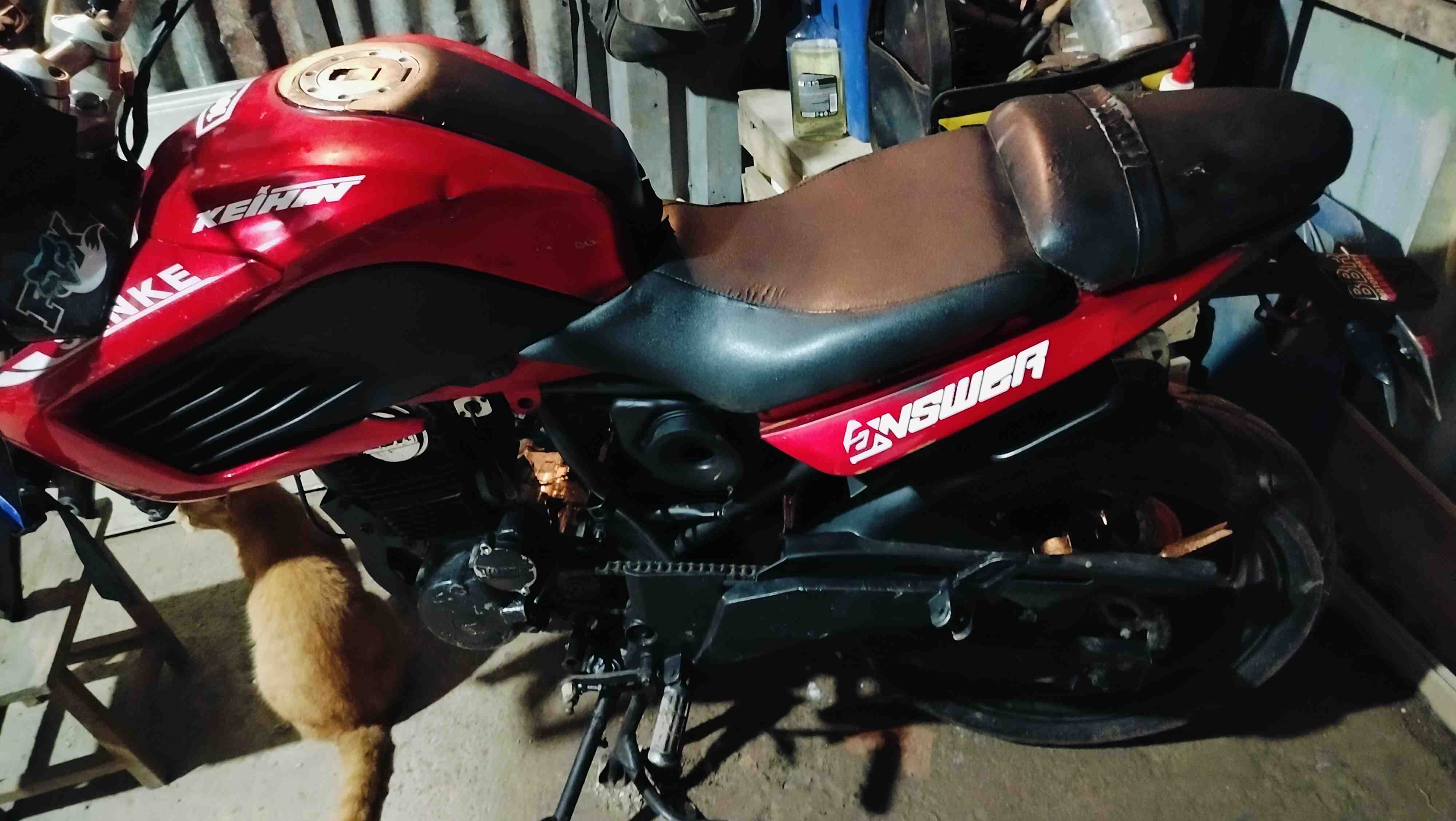 Moto senkke en color rojo con detalles en negro. Ideal para quienes buscan un vehículo ágil y económico para la ciudad. El asiento es cómodo y está en buen estado, aunque presenta un pequeño desgaste. Perfecta para desplazamientos diarios y escapadas de fin de semana.