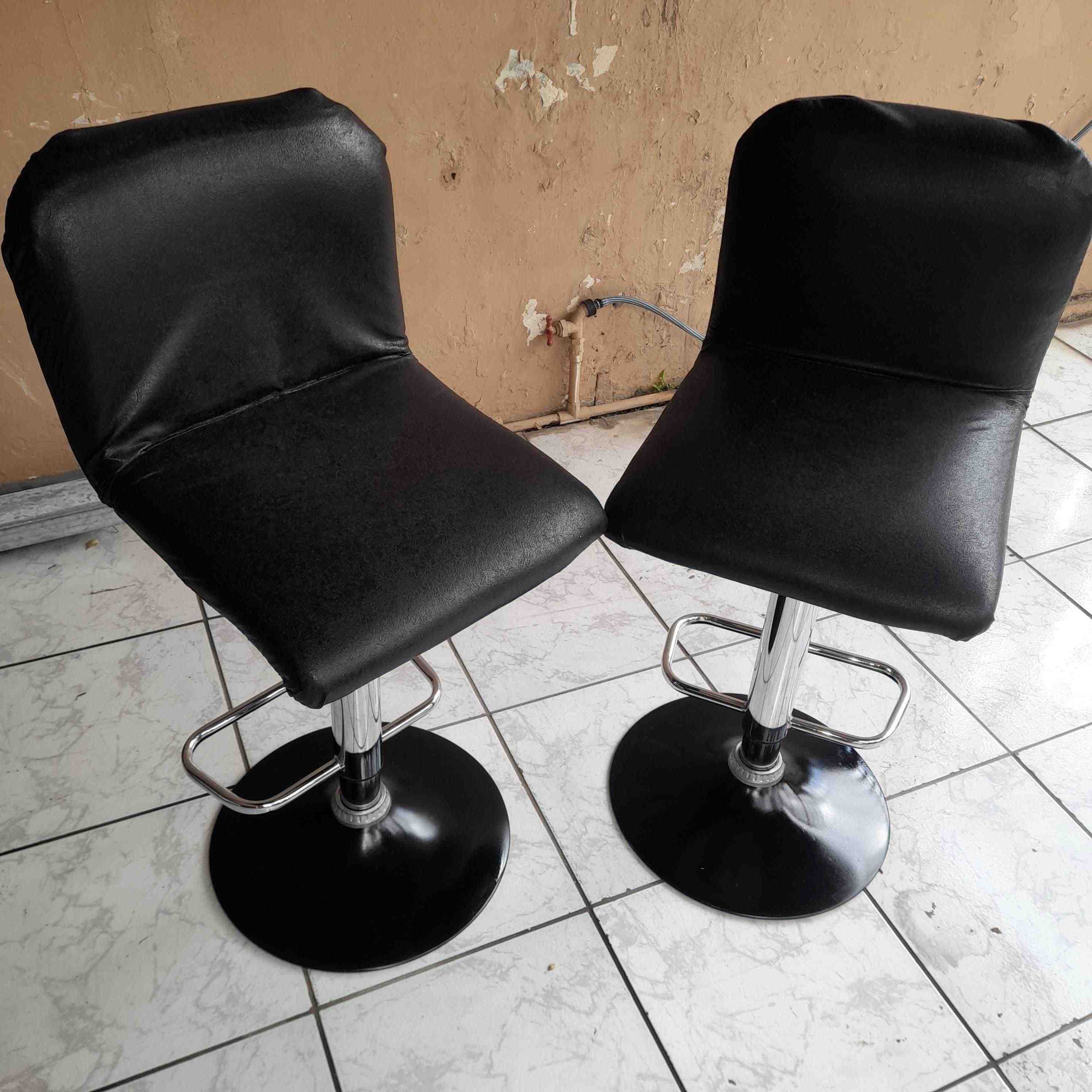 Par de sillas altas de bar con asiento y respaldo acolchados en color negro. La base es de metal con un diseño moderno y elegante. Ideales para barras de cocina o bares, ofreciendo comodidad y estilo. Ajustables en altura y con reposapiés para mayor confort.