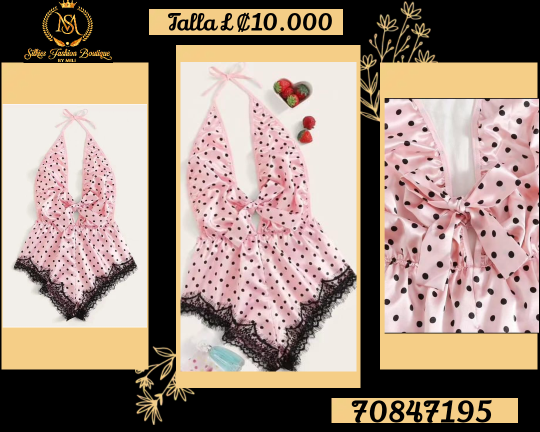 Este encantador babydoll en talla L presenta un diseño de lunares negros sobre un fondo rosa suave. Con un escote halter y un lazo decorativo en el frente, este conjunto es perfecto para una noche especial. Los detalles de encaje negro en el borde añaden un toque de elegancia y sensualidad.