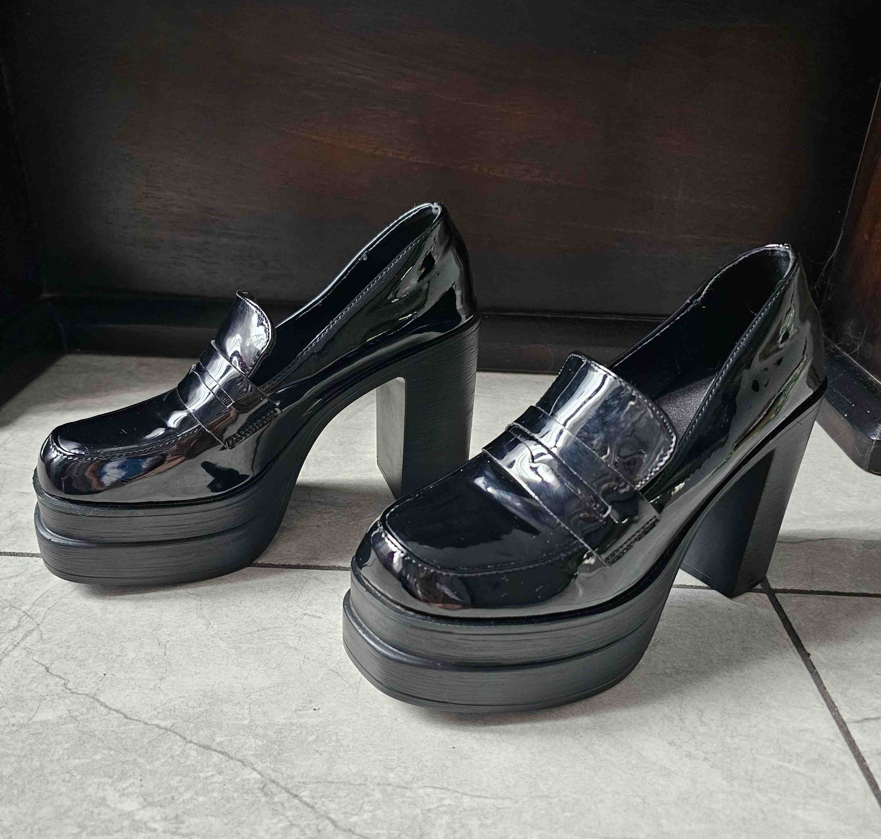 Elegantes zapatos de tacón alto en color negro con acabado brillante. Perfectos para ocasiones formales o para darle un toque sofisticado a cualquier atuendo. Su diseño con plataforma y tacón grueso proporciona estabilidad y comodidad al caminar. Ideales para combinar con vestidos, faldas o pantalones.
