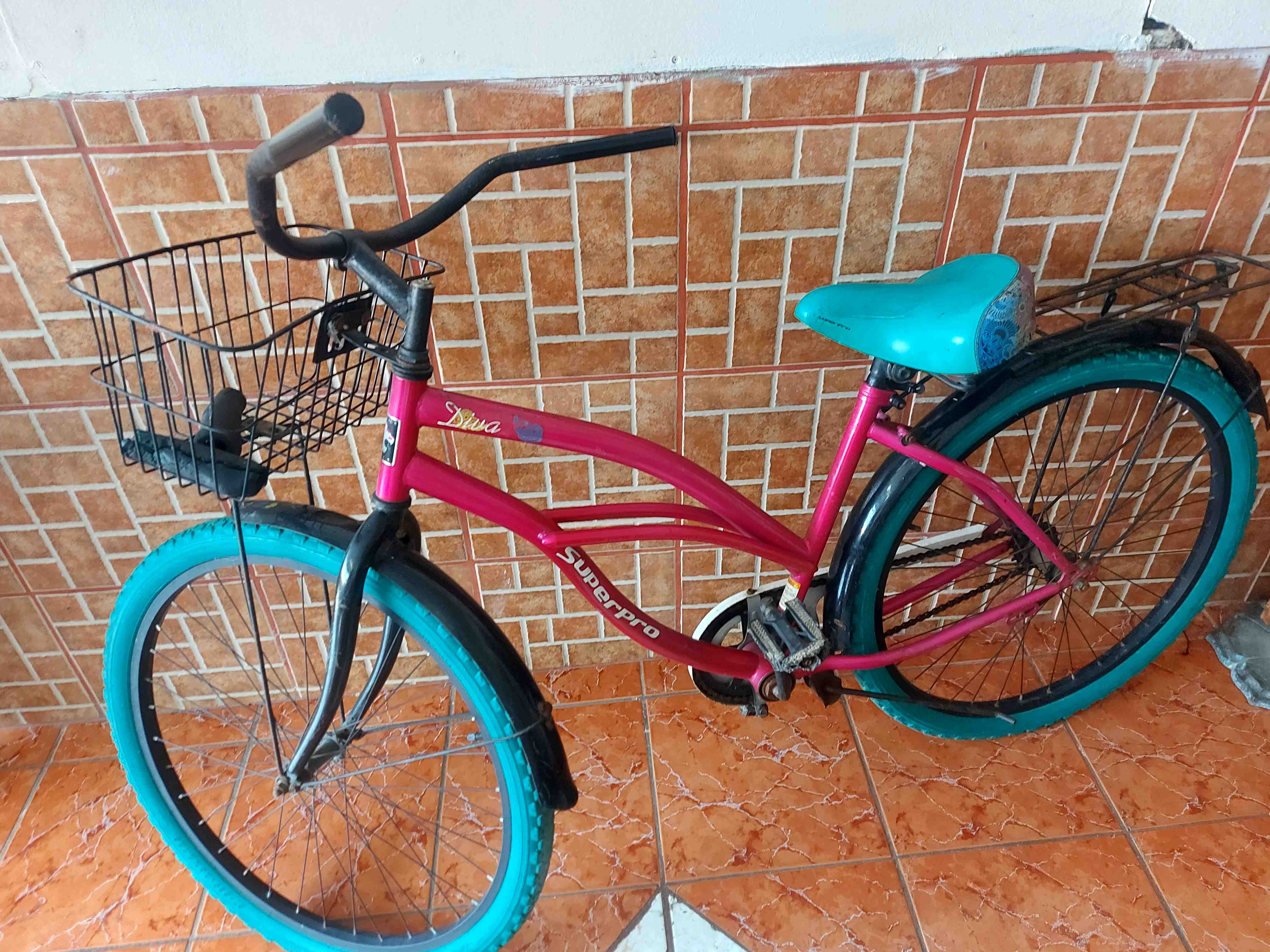 Bicicleta urbana de la marca Super Pro, modelo Diva. Cuenta con un diseño atractivo en color rosa con detalles en verde. Incluye una canasta delantera para mayor comodidad al transportar objetos. Ideal para paseos en la ciudad y desplazamientos cortos. Neumáticos en buen estado y asiento cómodo.