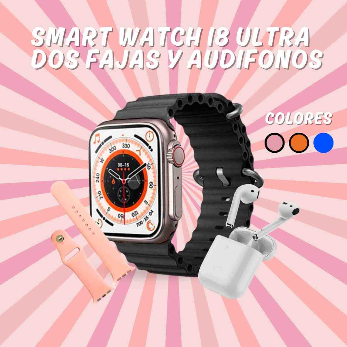 El Smart Watch I8 Ultra es el complemento perfecto para tu día a día. Incluye dos correas intercambiables en colores negro, naranja y azul, y audífonos inalámbricos para una experiencia completa. Con su diseño moderno y funcional, podrás monitorear tu actividad física, recibir notificaciones y disfrutar de tu música favorita en cualquier momento.
