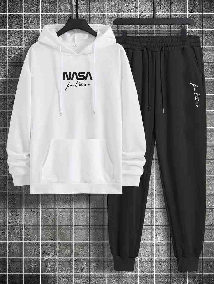 Este conjunto deportivo incluye una sudadera con capucha blanca y un pantalón negro, ambos con el logo de NASA. La sudadera ofrece un diseño moderno y cómodo, ideal para el uso diario o actividades deportivas. El pantalón cuenta con un ajuste relajado y cordones para mayor comodidad. Perfecto para los amantes del estilo casual y la exploración espacial.