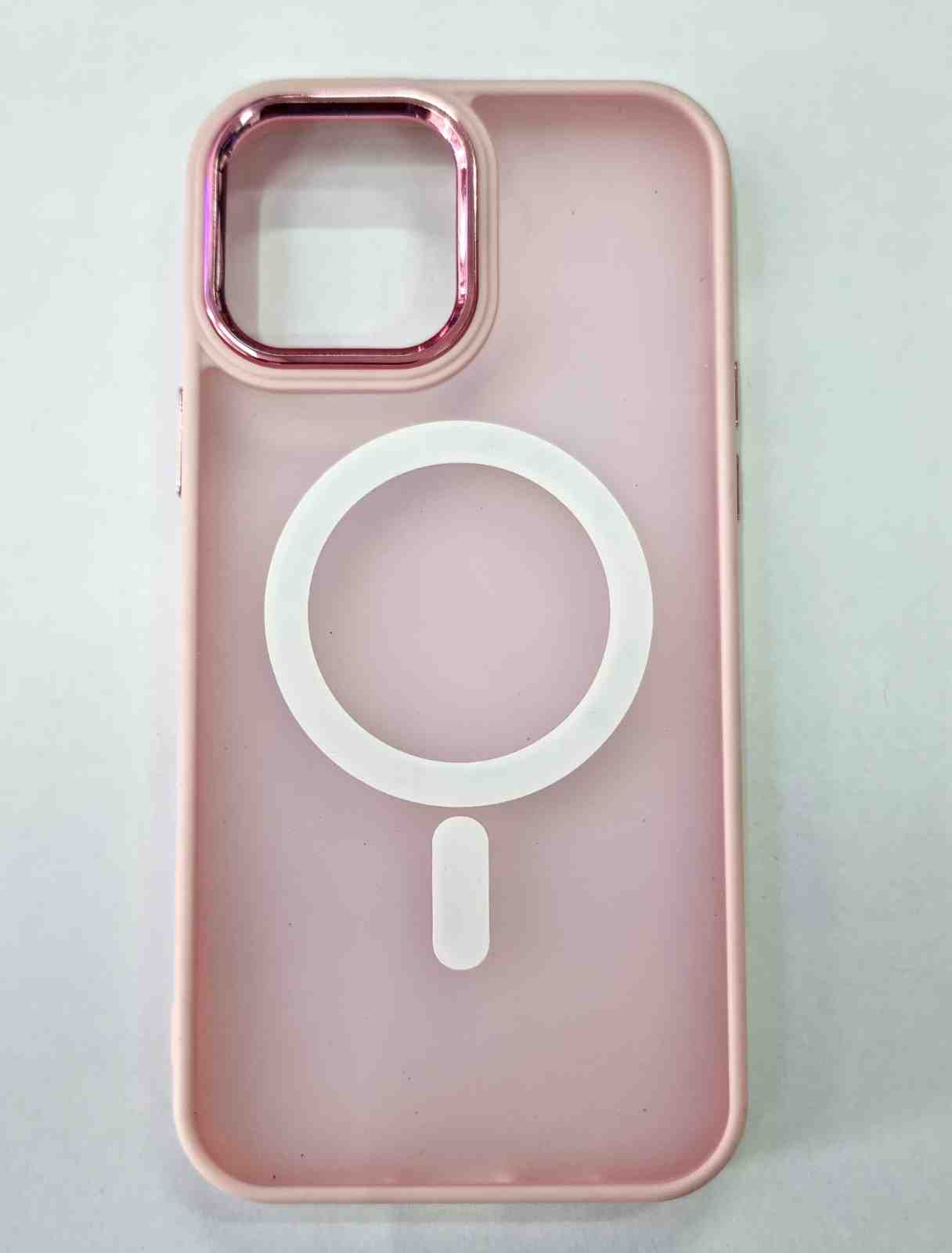 Elegante funda de color rosa diseñada para iPhone, con un acabado suave y un borde reforzado para proteger la cámara. Su diseño incluye un anillo magnético que facilita la carga inalámbrica. Ideal para quienes buscan combinar estilo y funcionalidad en su dispositivo.