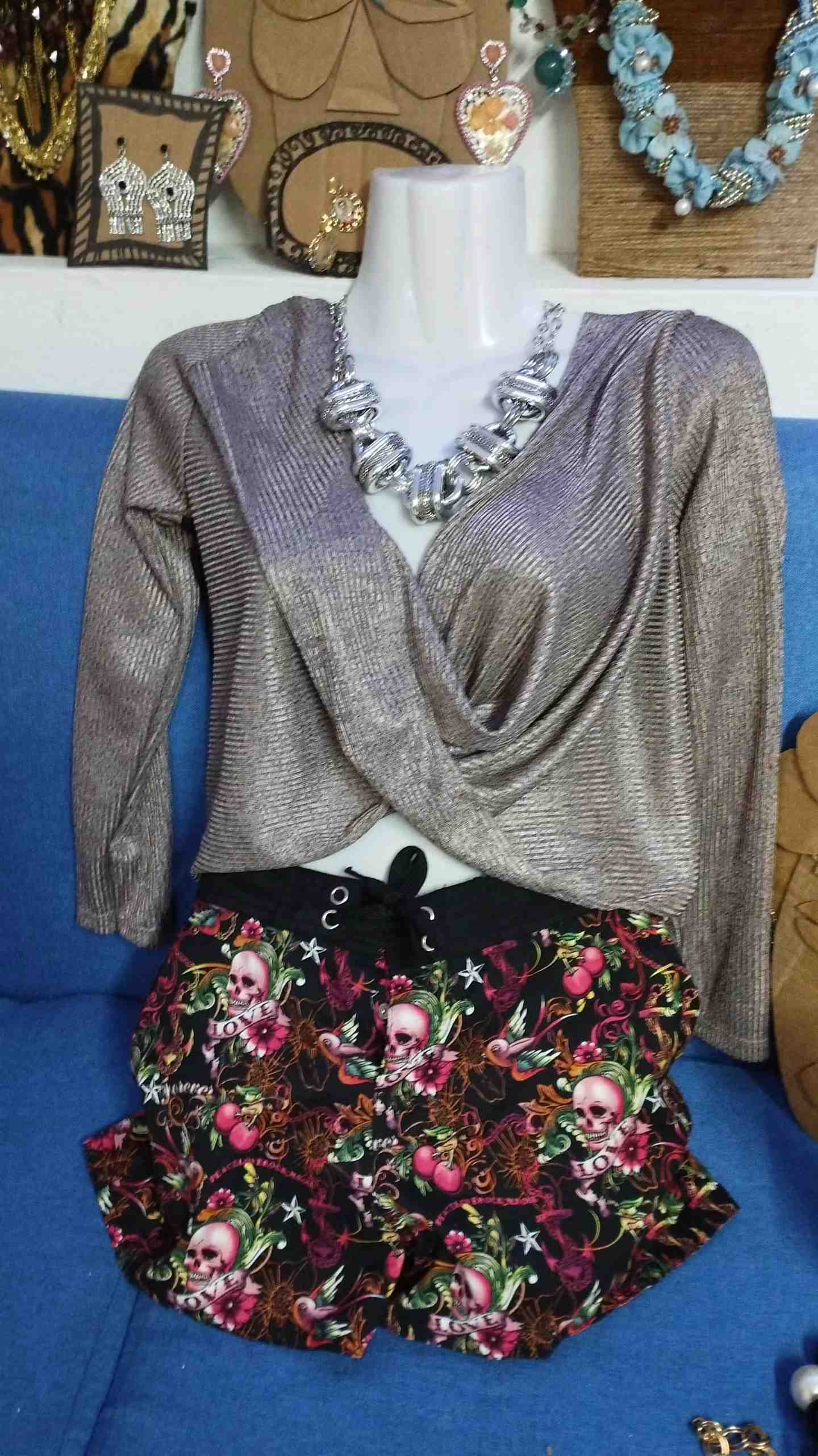 Este conjunto combina un top cruzado de color metálico con un diseño elegante y moderno, ideal para ocasiones especiales. La parte inferior presenta un estampado vibrante con motivos florales y de calaveras, aportando un toque atrevido y único. Completa el look un collar llamativo que añade un toque de sofisticación. Perfecto para quienes buscan destacar con estilo.