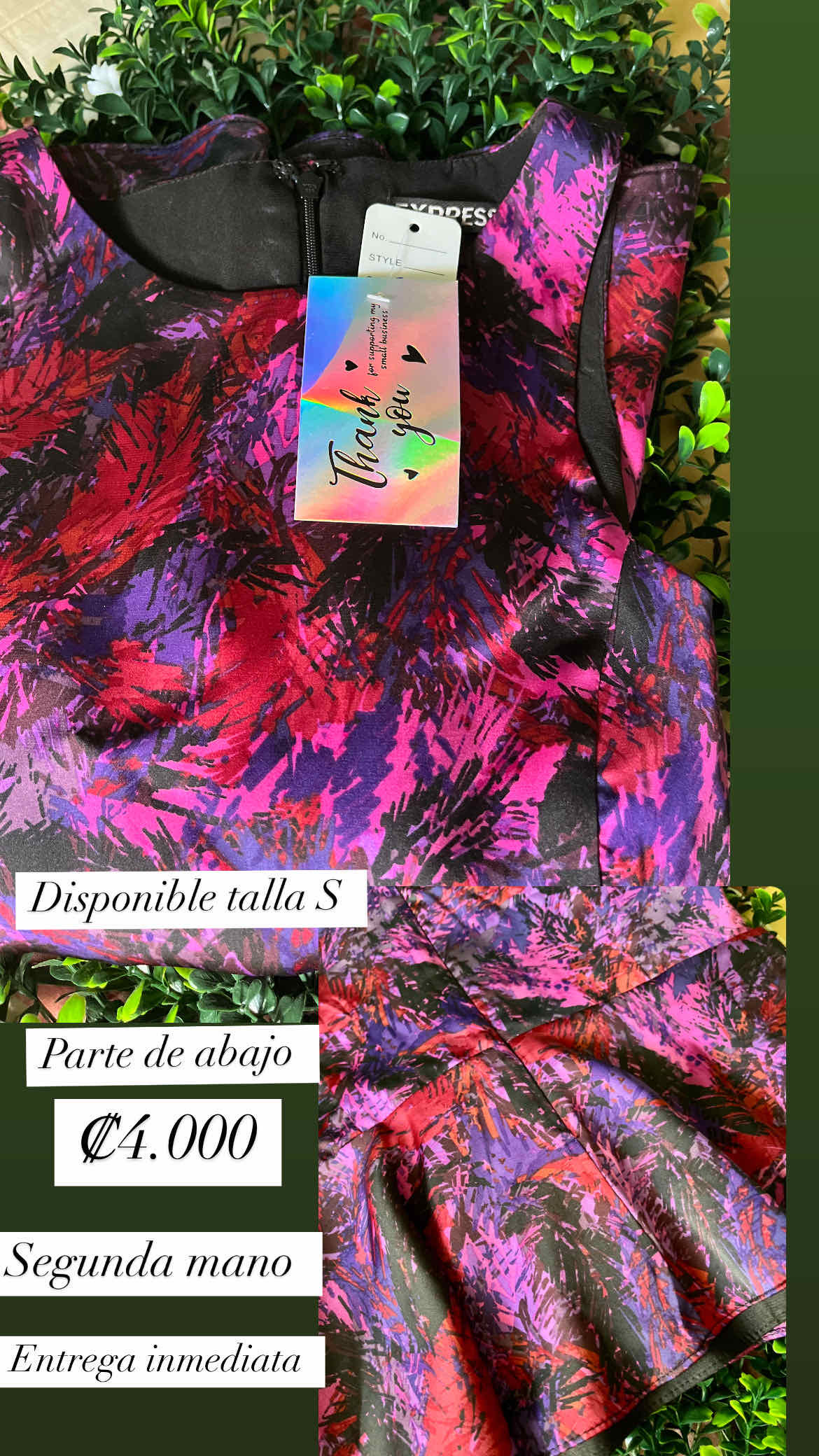 Esta vibrante blusa de segunda mano está disponible en talla S. Presenta un diseño colorido con tonos morados, rojos y negros, ideal para destacar en cualquier ocasión. La prenda está en excelente estado y lista para entrega inmediata. Perfecta para quienes buscan estilo y sostenibilidad.