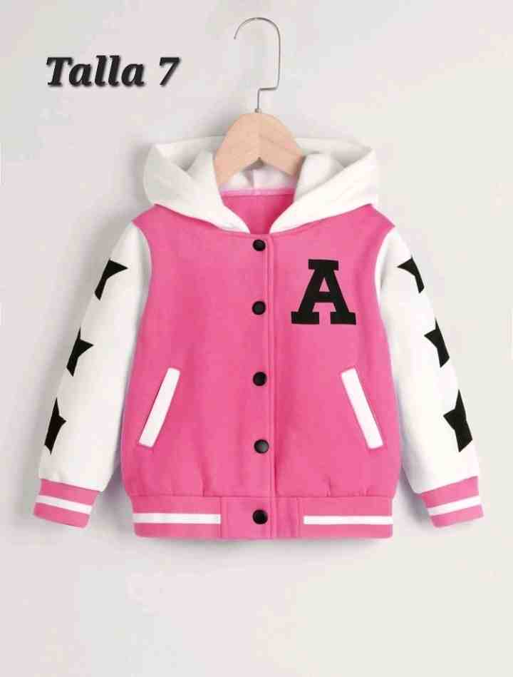 Esta chaqueta infantil en color rosa es perfecta para mantener a los pequeños abrigados y con estilo. Cuenta con una capucha blanca y mangas decoradas con estrellas negras, añadiendo un toque divertido. El diseño incluye bolsillos frontales y cierre de botones, ideal para el uso diario. Disponible en talla 7, es una opción cómoda y moderna para los niños.