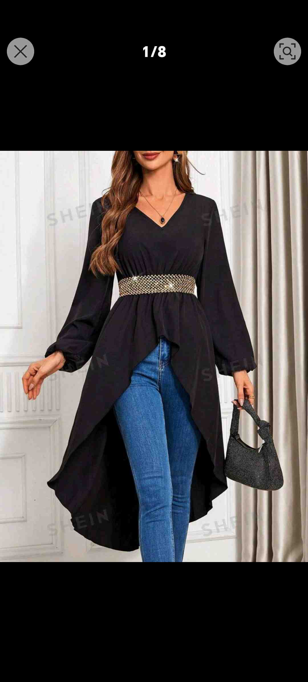 Esta blusa negra de diseño elegante presenta un corte asimétrico que añade un toque moderno a cualquier atuendo. Con mangas largas y un escote en V, es perfecta para ocasiones formales o casuales. El cinturón decorativo en la cintura realza la figura, mientras que el tejido suave asegura comodidad durante todo el día. Ideal para combinar con jeans o pantalones formales.