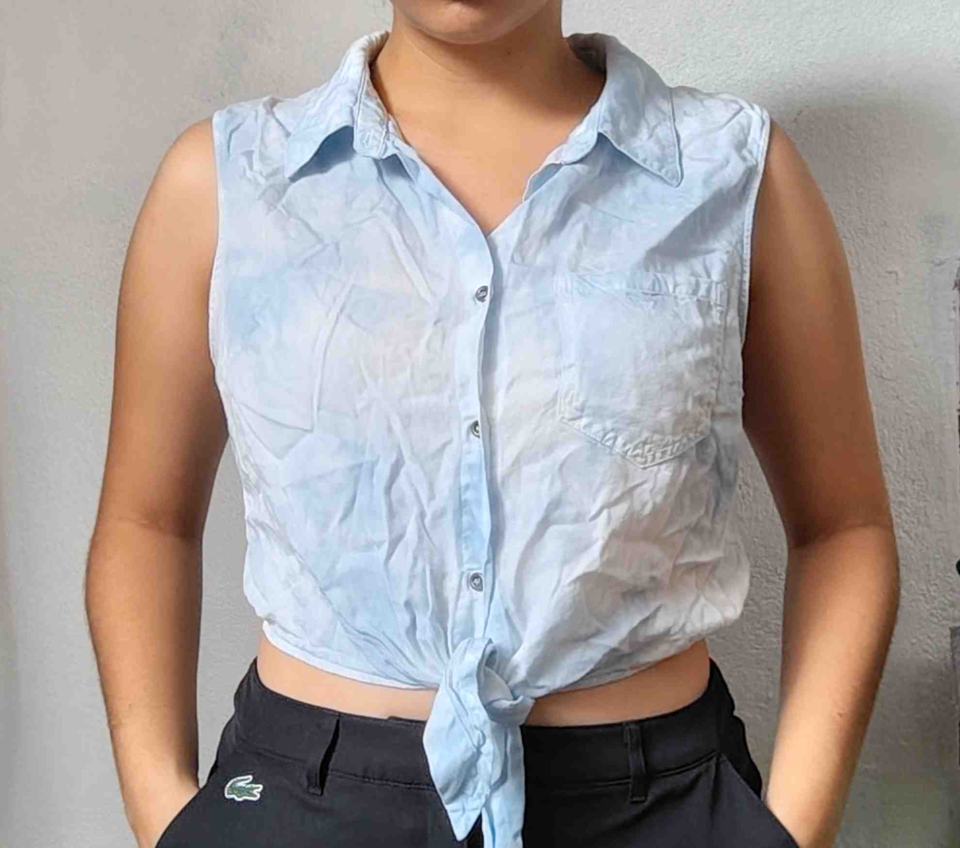 Esta blusa sin mangas es perfecta para los días cálidos. Con un diseño anudado al frente, ofrece un estilo casual y moderno. Su color azul claro es versátil y fácil de combinar con diferentes prendas. Ideal para un look relajado y cómodo, esta blusa es una excelente adición a tu guardarropa de verano.