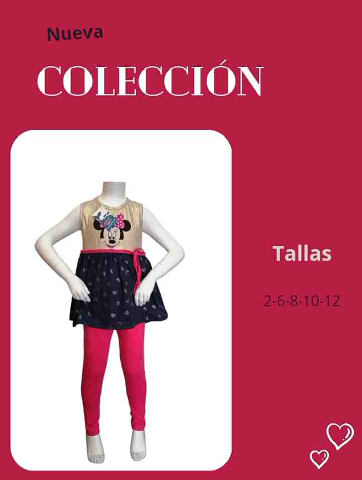 Este encantador conjunto infantil presenta un diseño de Minnie Mouse, ideal para las pequeñas fanáticas de Disney. Incluye una blusa sin mangas con un estampado colorido y un lazo decorativo, combinada con unos leggings en un vibrante color rosa. Disponible en tallas 2, 6, 8, 10 y 12, es perfecto para cualquier ocasión casual o especial.