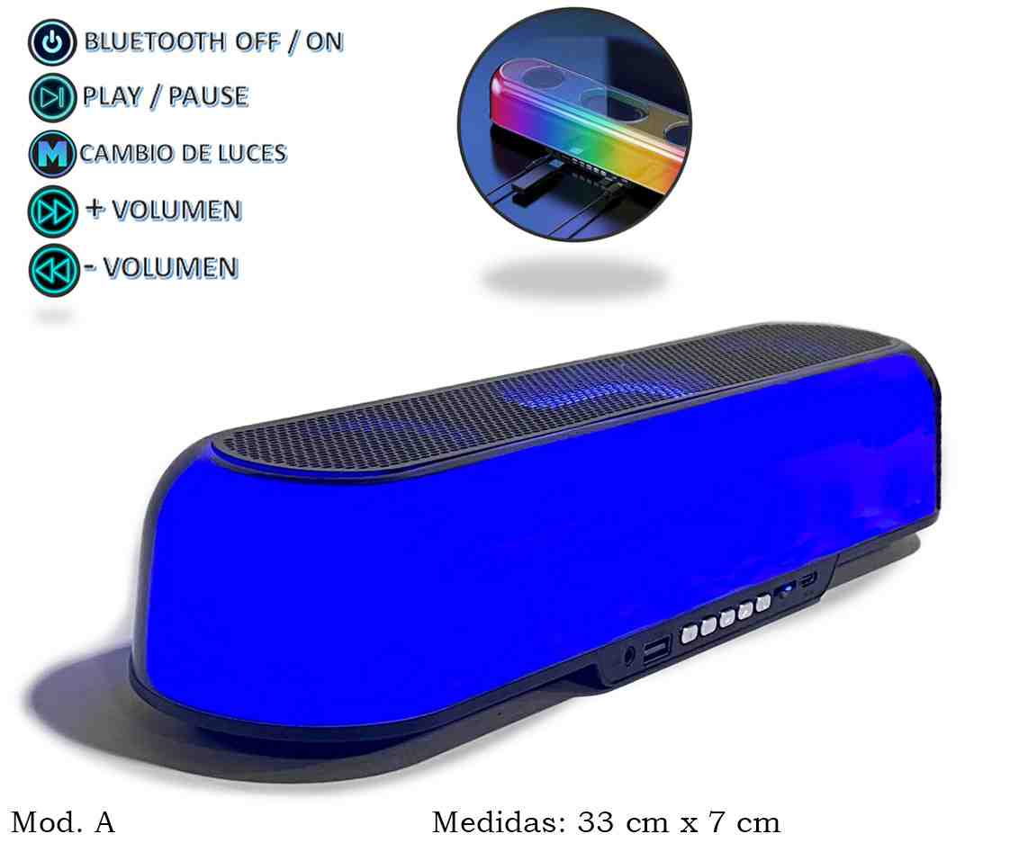 Este altavoz Bluetooth ofrece una experiencia de sonido envolvente con un diseño moderno y atractivo. Cuenta con luces LED que cambian de color, añadiendo un toque visual a tu música. Sus controles intuitivos permiten ajustar el volumen y cambiar de pista fácilmente. Ideal para cualquier ambiente, mide 33 cm x 7 cm, lo que lo hace portátil y fácil de ubicar en cualquier espacio.