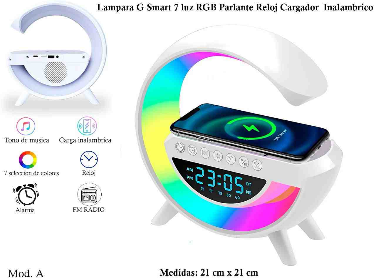 Esta innovadora lámpara G Smart combina múltiples funciones en un diseño moderno y elegante. Ofrece luz RGB con 7 opciones de color, un altavoz integrado para reproducir música, y un reloj digital con alarma. Además, cuenta con carga inalámbrica para dispositivos compatibles, haciendo de este producto una solución completa para tu mesita de noche. Sus dimensiones compactas de 21 cm x 21 cm la hacen ideal para cualquier espacio.