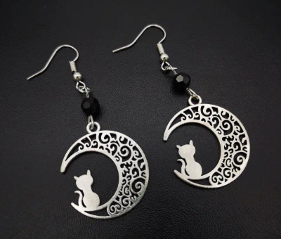 Estos pendientes presentan un diseño único con una figura de gato sentado en una luna creciente, elaborados en metal con detalles intrincados. El acabado plateado les da un toque sofisticado, mientras que la cuenta negra añade un contraste elegante. Son ideales para quienes buscan un accesorio distintivo y con estilo.