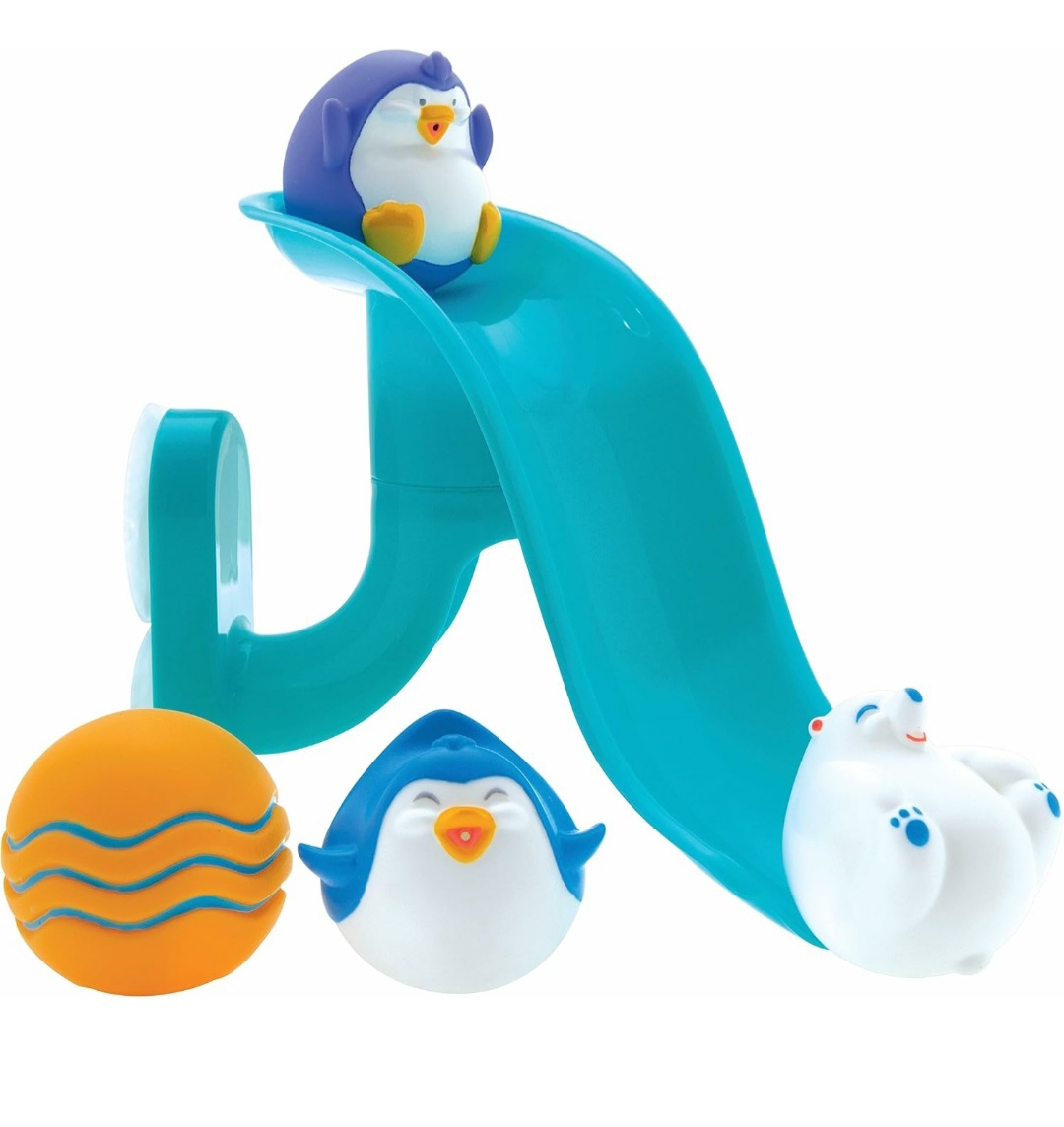 Este juguete de baño incluye un tobogán azul con adorables figuras de animales como un pingüino y un oso polar. Ideal para hacer del baño una experiencia divertida y educativa para los más pequeños. Fabricado con materiales seguros y duraderos, es perfecto para estimular la imaginación y el juego interactivo.