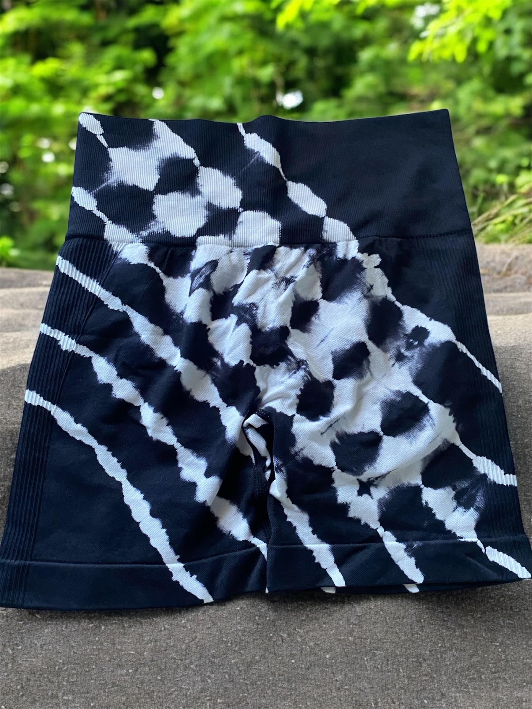 Estos shorts deportivos presentan un diseño moderno de tie-dye en blanco y negro, ideal para actividades físicas o un look casual. Fabricados con materiales elásticos y transpirables, ofrecen comodidad y libertad de movimiento. Su cintura alta proporciona un ajuste seguro y favorecedor, perfecto para cualquier tipo de entrenamiento.