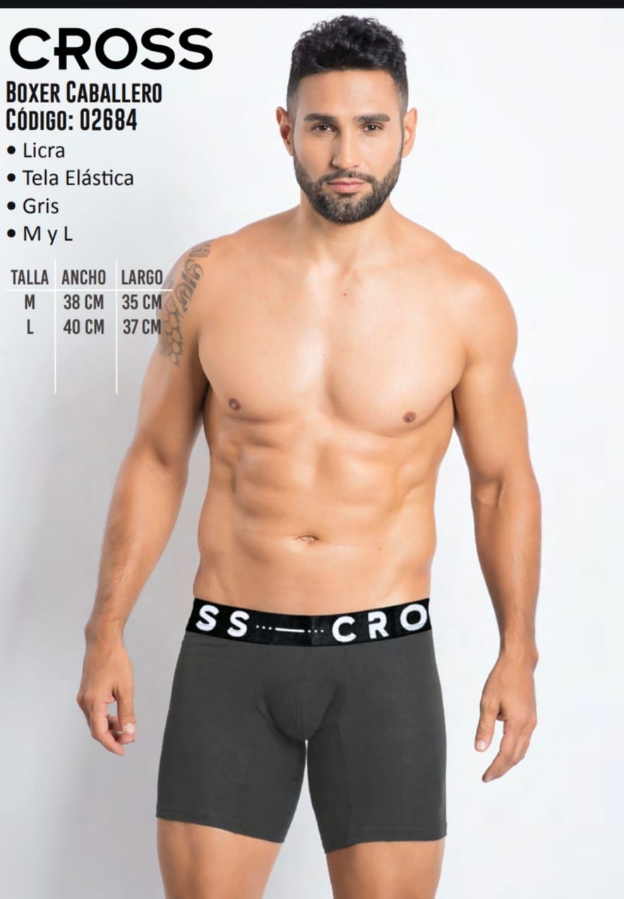 Este bóxer para caballero de la marca Cross está confeccionado en licra y tela elástica, ofreciendo comodidad y ajuste perfecto. Disponible en color gris, es ideal para el uso diario. Se presenta en tallas M y L, con medidas de ancho y largo que aseguran un calce adecuado. Su diseño moderno y funcional lo convierte en una excelente opción para quienes buscan calidad y estilo.