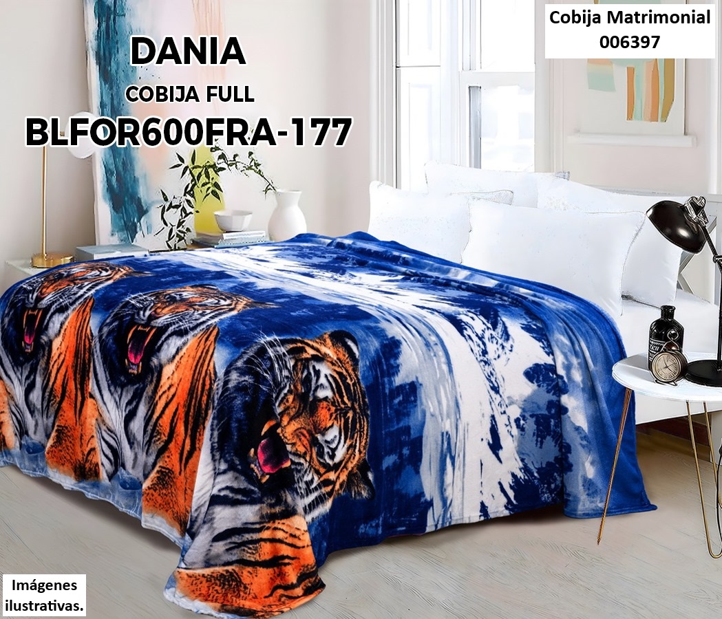 Esta cobija matrimonial de la marca Dania ofrece un diseño vibrante con tigres en tonos naranjas y azules, ideal para añadir un toque salvaje a tu dormitorio. Fabricada con materiales de alta calidad, garantiza calidez y confort durante las noches frías. Su tamaño full es perfecto para camas matrimoniales, asegurando una cobertura completa y acogedora.