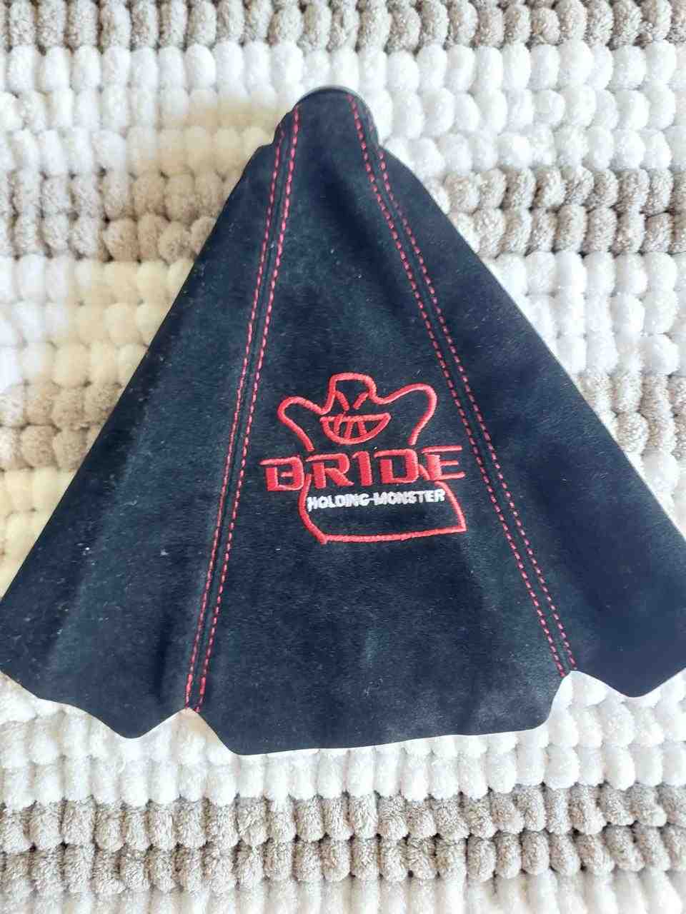 Funda de palanca de cambios de la marca Bride, diseñada para mejorar el interior de tu vehículo con un toque deportivo. Fabricada con materiales de alta calidad, ofrece durabilidad y un ajuste perfecto. Su diseño en color negro con costuras rojas añade un estilo único y atractivo.