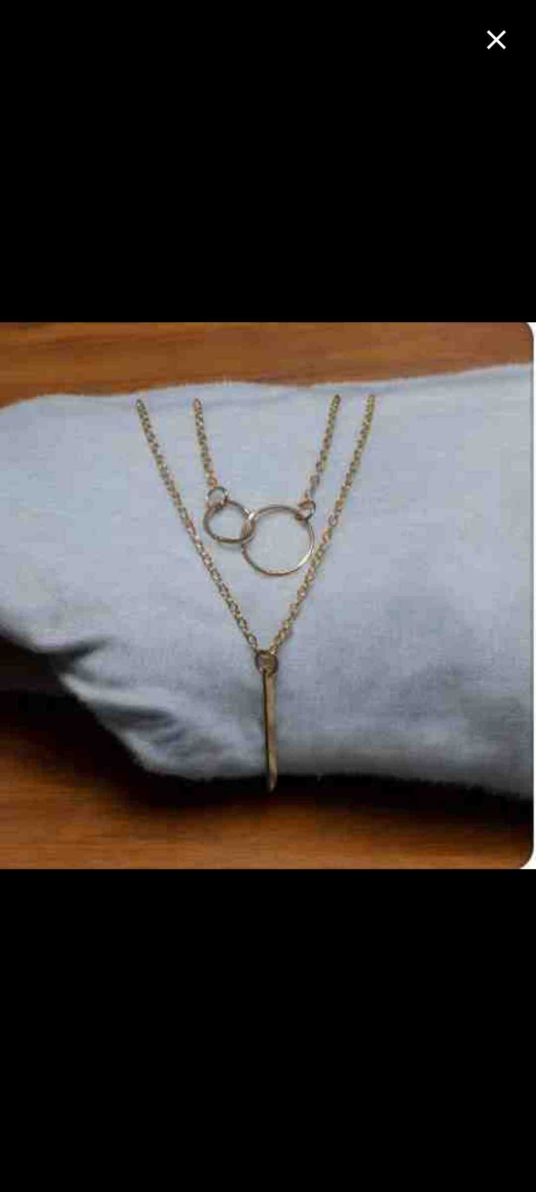 Este collar doble presenta un diseño moderno con dos cadenas de eslabones finos. Cada cadena sostiene un colgante único: uno con dos anillos entrelazados y otro con un colgante alargado. Ideal para complementar cualquier atuendo, este accesorio es perfecto para ocasiones especiales o uso diario.