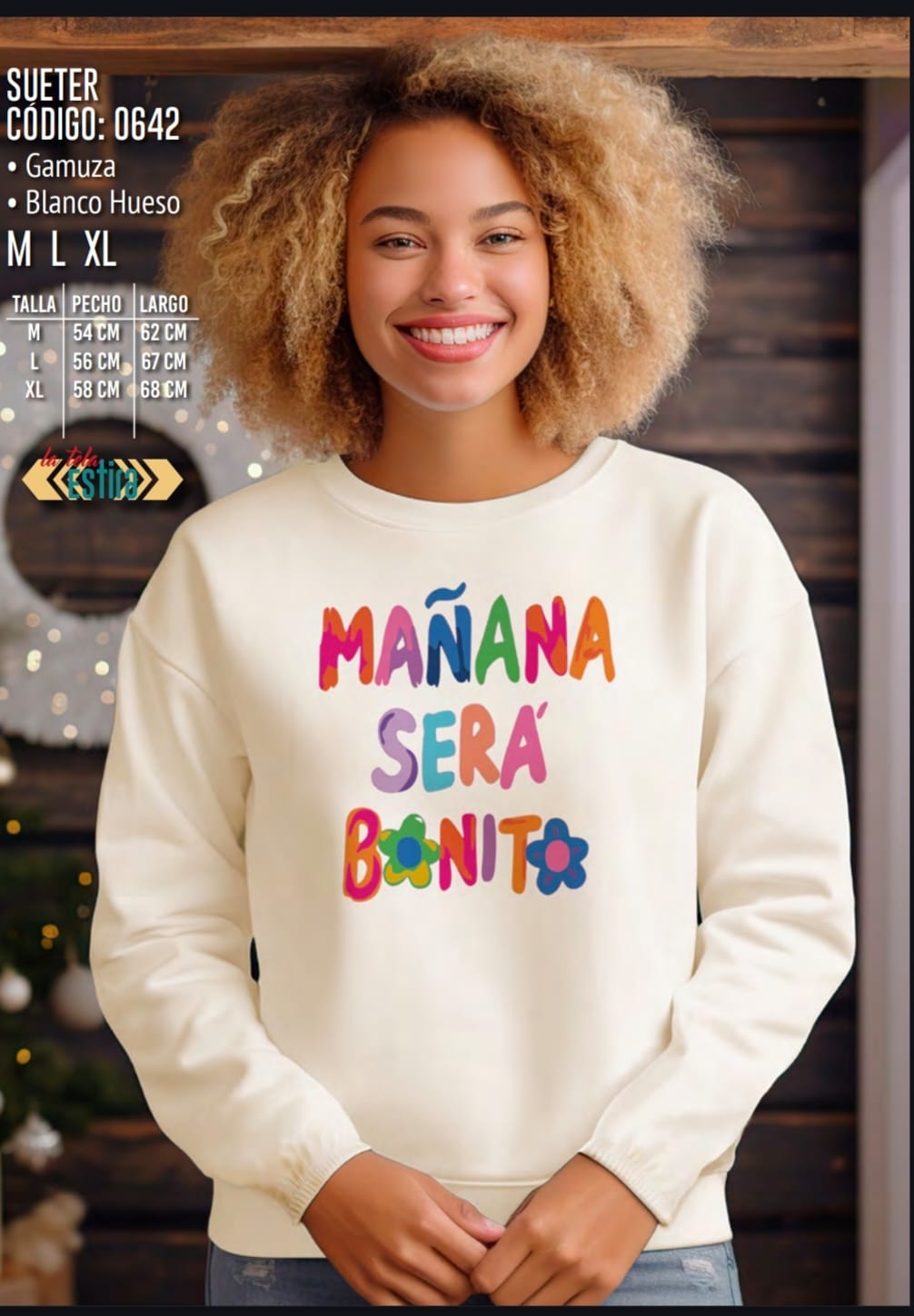 Este suéter de gamuza en color blanco hueso es perfecto para cualquier ocasión. Con un diseño alegre que dice 'Mañana será bonito', aporta un toque de optimismo a tu día. Disponible en tallas M, L y XL, ofrece comodidad y estilo. Ideal para combinar con jeans o faldas, es una prenda versátil para tu guardarropa.