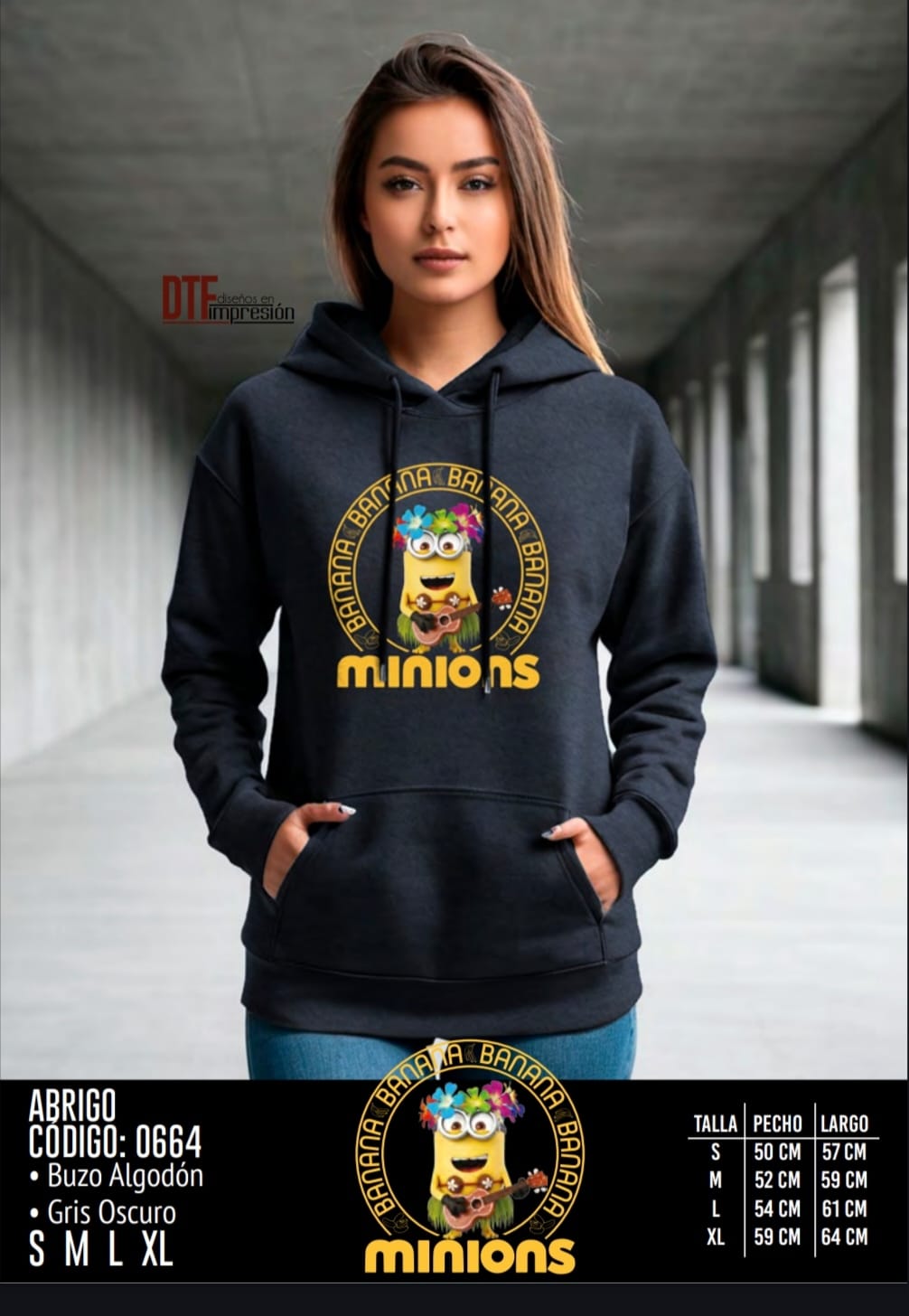 Este buzo de algodón en color gris oscuro es perfecto para los fanáticos de los Minions. Con un diseño divertido y colorido, presenta a un Minion con una guitarra y flores, rodeado de la palabra 'banana'. Disponible en tallas S, M, L y XL, es ideal para mantenerte cómodo y a la moda.