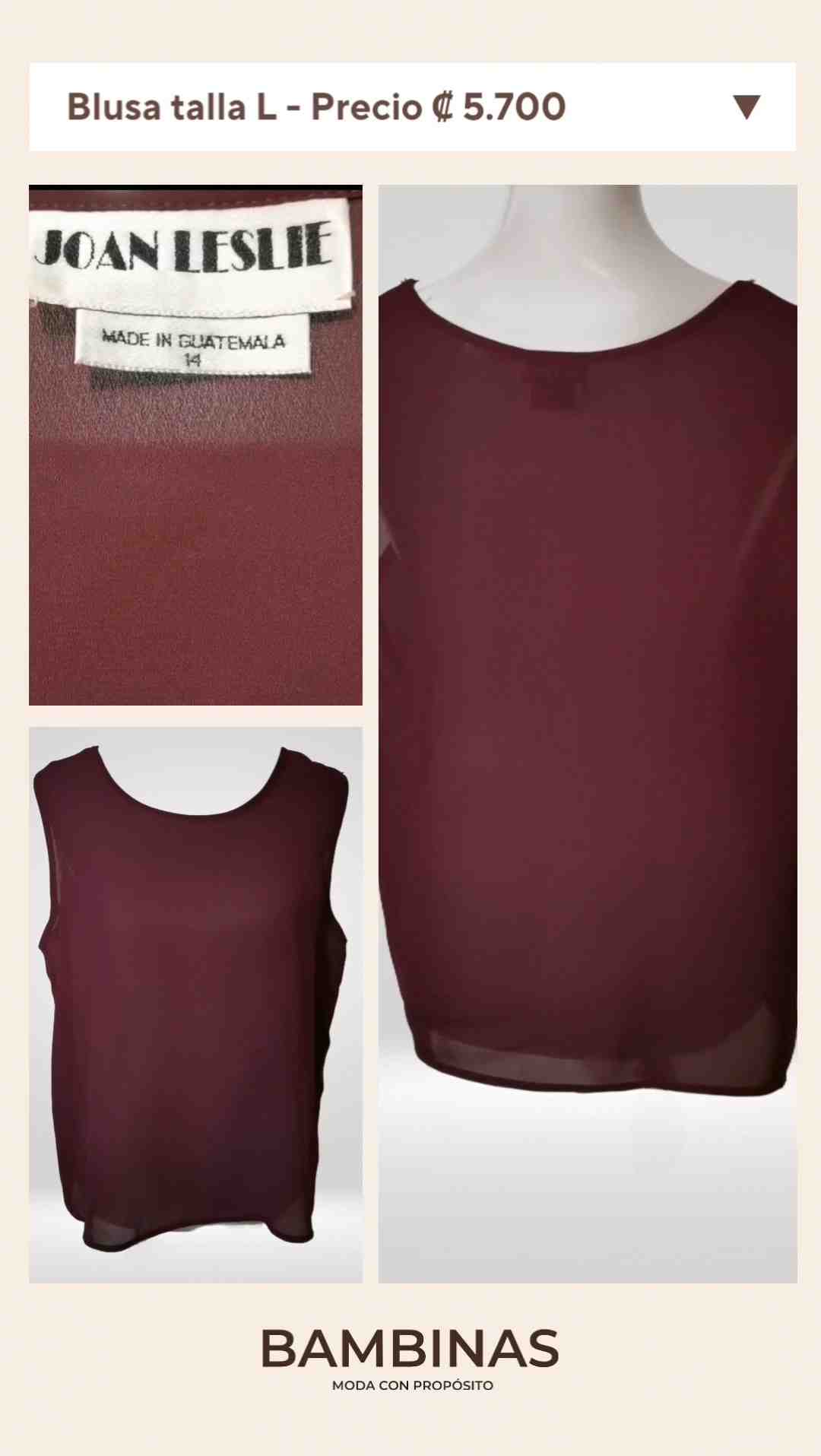 Esta blusa de la marca Joan Leslie es una prenda elegante y versátil, ideal para cualquier ocasión. Confeccionada en Guatemala, ofrece un diseño sin mangas y un corte clásico que se adapta a la figura. Su color burdeos le da un toque sofisticado, perfecto para combinar con diferentes estilos. Ideal para complementar cualquier look.