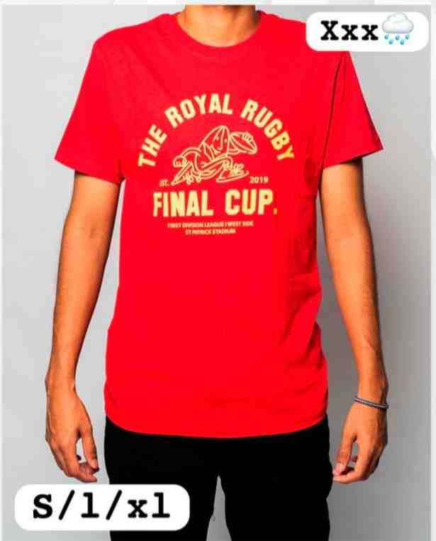Camiseta roja de manga corta con diseño gráfico de 'The Royal Rugby Final Cup'. Fabricada en material suave y cómodo, ideal para uso casual. Disponible en tallas S, L y XL. Perfecta para los amantes del rugby y el estilo deportivo.